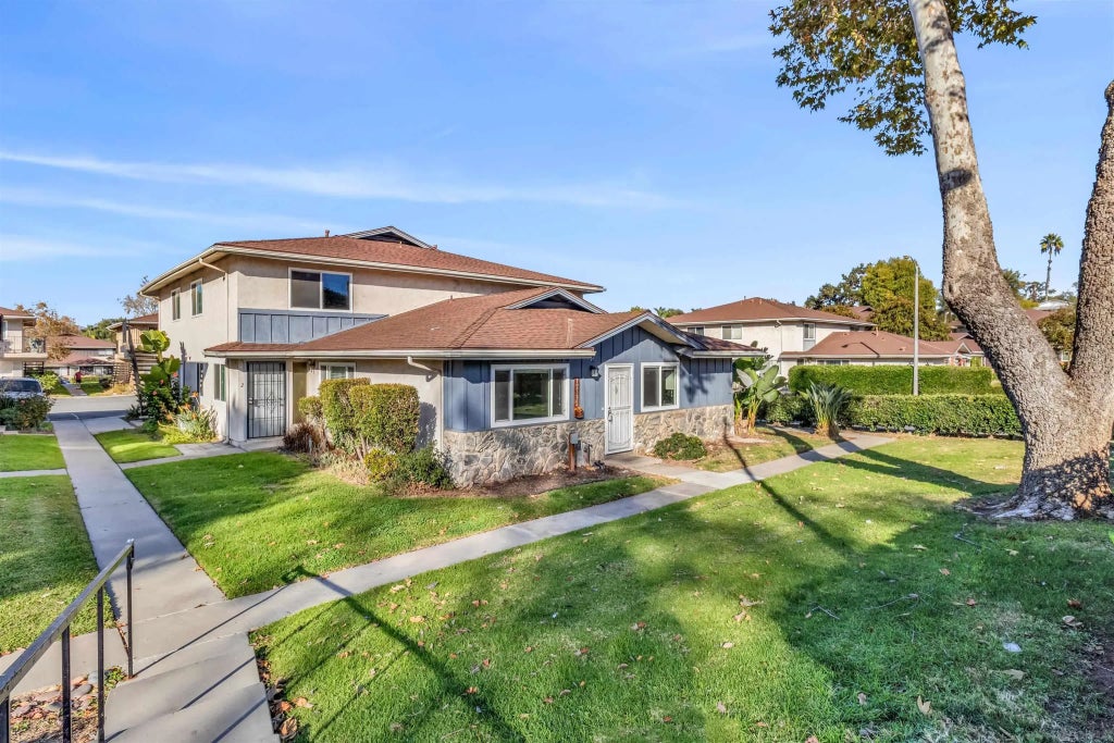 This beautifully updated 2-bedroom, 1-bath condo sits on a corner lot with privacy provided by mature hedges. The modern kitchen features white shaker cabinets, marbled quartz countertops, and an island with bar seating, opening to the bright living room with built-in surround sound and recessed lighting. Upgraded bathroom, ceiling fans, and central AC for comfort. Includes a shared 1-car garage, additional parking space, and ample guest parking. Low HOA , landscaping, pool, jacuzzi, and BBQ area. VA and FHA approved.