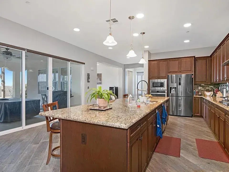 Nestled high above the rolling hills in the exclusive gated community of Valley View Ranch, this sprawling single-story ranch home offers breathtaking, 360-degree panoramic views, extending to the ocean on clear days. Situated on nearly 5 acres at the end of a peaceful cul-de-sac, the property exudes a sense of calm and idyllic retreat from the hustle and bustle of everyday life. The warm and inviting interior features soaring 10-foot ceilings, durable and stylish wood-look tile flooring throughout, elegant crown molding, plantation shutters, and designer ceiling fans. Designed to optimize indoor/outdoor living, the home boasts a charming covered courtyard/veranda area between the formal dining room and the great room, currently used as a game room with a pool table included. The spacious primary suite offers an oversized closet and French doors leading to the veranda, where you can relax and enjoy the stunning views in serene privacy.