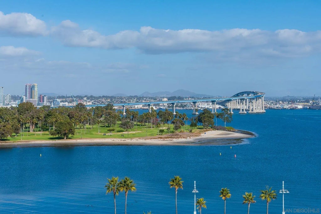 Nice, large and comfortable one bedroom, TWO bathroom with joyous views of the graceful arch of the Coronado Bridge, San Diego Bay, sparkling city lights and so much more! Sit out on your fabulous 150 square foot plus balcony with nice morning sun and no hot afternoon sun or enclose the balcony to make your interior living space larger. The spaciousness and gracious proportions of every room exceeds the space in most two bedroom condos being built today. The adjacent similarly sized unit 906 is also available to purchase and combine with unit 905 for well over 2200 sq. ft. of interior living space configured to your specifications. And talk about location...there are no better locations than Coronado Shores. Walk out of your impressive grand lobby greeted by your 24 hour doorperson and take a two minute stroll to the white sand beach, 3/4 Olympic sized pool, hot tub and two of eight championship tennis/ pickleball courts. Hit the well equipped gym or have a drink with your neighbors and friends at your private oceanfront Beach Club. A ten minute level walk along the beach brings you to the glamorously restored Hotel Del Coronado. Five more minutes, and you're in the heart of The Village, where you can choose from dozens of restaurants, attend live theater or the movies and pick up groceries without ever setting foot into a car. You deserve the super high quality of life that comes with living at prestigious Coronado Shores. Start living it today!