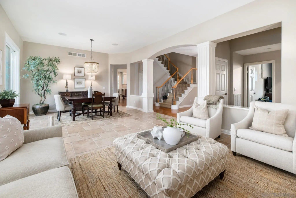 Price Improvement! Discover the charm of 5295 Beachcomber Ct, a beautiful home tucked away on a quiet cul-de-sac in the highly sought-after Palma Del Mar neighborhood of Ashley Falls. The thoughtfully designed floor plan includes formal living and dining rooms which offer tranquil views of the backyard, setting the stage for both everyday living and elegant entertaining. The kitchen is a chef's dream, featuring an oversized island, sleek white cabinetry, stainless steel appliances, quartz countertops, and a stylish tile backsplash. The kitchen seamlessly flows into the inviting family room, complete with cozy fireplace. The first-level private bedroom is ideal for hosting overnight guests or creating a custom home gym. The second level includes an expansive primary suite that serves as a serene retreat with its spa-inspired bathroom, providing the perfect haven for relaxation. Three additional spacious bedrooms and a versatile loft ensure plenty of room for family, work, or play. The backyard is a private oasis, showcasing mature landscaping that offers ultimate seclusion, along with a sparkling pool and spa that make outdoor living and entertaining a year-round luxury. Additional features include owned solar, custom window treatments, neutral designer paint, and upgraded lighting. Nestled in the heart of Carmel Valley, this home offers a rare combination of no HOA and low Mello Roos with close proximity to top-rated schools and premier shopping and dining at the Pacific Highlands Ranch Town Center, Del Mar Highlands, and One Paseo.