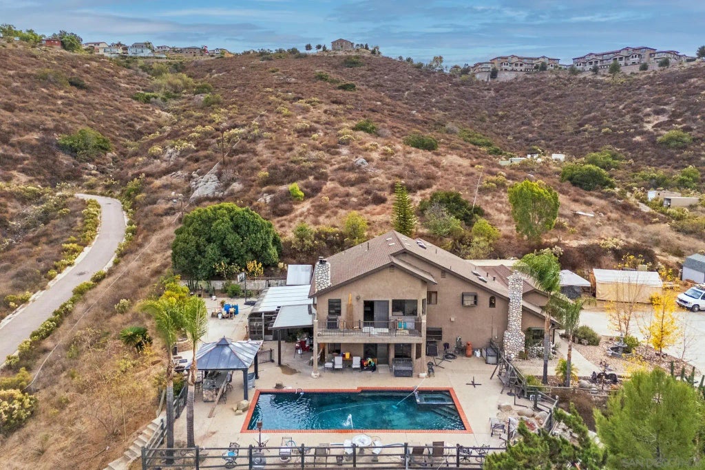 Welcome to your dream home! Nestled on 5.04 private acres in the desirable community of Santee, this stunning two story estate combines modern elegance with serene countryside charm. Boasting 3,488 square feet of living space, this home features 5 spacious bedrooms and 5 beautifully appointed bathrooms, offering ample space for family and guests. As you enter through the private gate and make your way up the scenic driveway, you'll be greeted by breathtaking views and lush landscaping, including mature fruit trees. The centerpiece of this incredible property is the sparkling pool and spa, perfect for entertaining or unwinding under the California sun. For outdoor enthusiasts, the lower lot is equipped with RV hookups, while the expansive acreage provides endless opportunities for gardening, recreation, or building a custom ADU to suit your needs. Inside, you'll find an open and airy layout with high ceilings, natural light, and premium finishes throughout. The gourmet kitchen features beautiful countertops, stainless steel appliances, and an island perfect for gathering. The spacious primary suite offers a private retreat with a luxurious en suite bathroom, expansive closet, and balcony overlooking the estate. Conveniently located just minutes from shopping, dining, and freeway access, this home combines privacy and convenience, creating the ultimate lifestyle. Don’t miss the chance to make this rare gem your own!