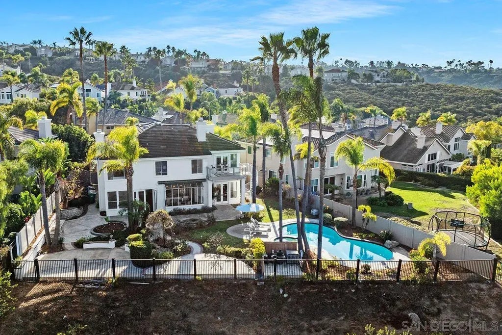 This exceptional property in Carmel Valley is located in the highly sought-after Santa Fe Summit neighborhood, nestled on a spacious lot with breathtaking northern views of the Del Mar afternoon balloons. Enjoy complete privacy in your own backyard, with peaceful canyon preserve views. The lush tropical landscaping is perfect for al fresco entertaining, featuring a large pool, spa, firepit, and a built-in BBQ, allowing you to embrace the best of California outdoor living. Enter through a grand double-door entry into a dramatic 20-foot ceiling foyer, where clear story windows surround the living and dining areas, highlighting a majestic fireplace and a sweeping staircase. The family room, also featuring a stunning fireplace, opens to the kitchen, which boasts a breakfast area and a full wall of windows framing the beautiful views. The kitchen is equipped with high-end appliances, great center island and custom cabinets. The first level also includes a full bedroom and bath, a powder room, laundry room, and a 3-car garage. The spacious primary suite features a sitting room, dual-facing fireplace, and a view deck with panoramic views over the backyard. The en-suite bathroom includes a large walk-in closet, double sinks, a spacious shower, and a soaking tub. The two secondary bedrooms share a Jack-and-Jill baths, while the 5th bedroom has its own full bath. Low HOA fees. Located just moments from award-winning schools, beautiful parks, shopping, popular beaches, amazing restaurants, and theaters—this home offers the perfect combination of luxury, convenience, and location.