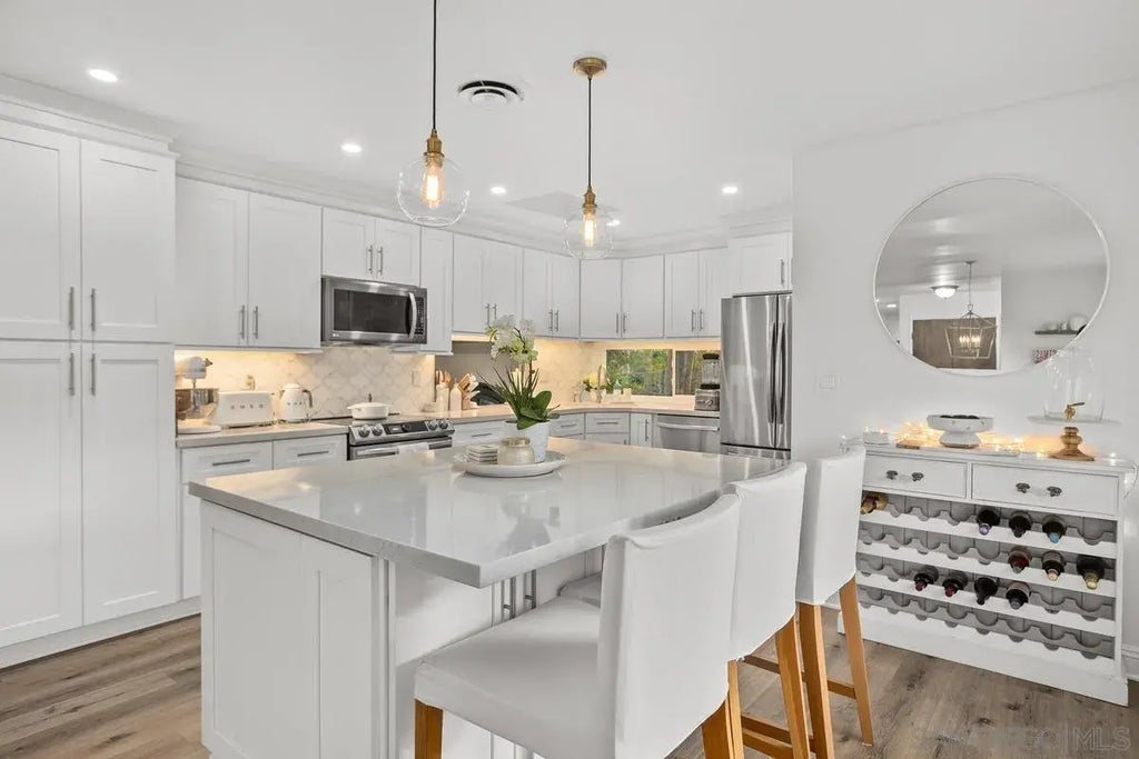 Nestled in the heart of the sought after hills of Southeast Escondido, this beautifully remodeled Ranch Style home sits on over half an acre of peaceful private land, with beautiful views that make you feel as if you’re entering Tuscan Italy! With an open concept modern farmhouse custom kitchen with large kitchen island, gleaming quartz stone, all stainless appliances and adjoining formal dining area, the home could be described as an entertainer’s paradise!! All living areas boast sweeping luxury oak look vinyl plank flooring, and bright white custom paint. The extremely spacious formal living room and separate family room with cosy fireplace overlook the gorgeous southeast facing views of the private swimming pool, Cyprus trees, a mature fruit producing orchard and a mountain view backdrop to top it off!! Sip your morning coffee on the private patio watching the sun rise over the pool and mountains. The home also features 4 spacious bedrooms, and 2 modernized bathrooms, complete with custom tile and granite counter tops. The home is located on an extremely private, quiet cul-de-sac tucked away from the buzz of the City of Escondido but still within a few minutes to the 15 freeway.