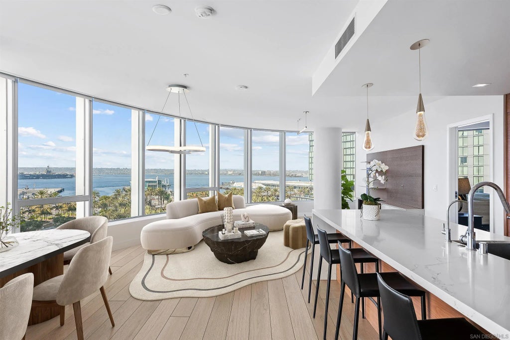 Welcome to San Diego's most distinguished residential tower, Pacific Gate. Spanning just over 1,800 sq. ft., this turn-key luxury condo features 2 bedrooms, 2.5 bathrooms, ample storage space, beautiful upgrades, and exquisite bay views. A curved form living area wall of oversized windows offers panoramic southwest, northwest, bay, and city views. Elegantly upgraded, the home boasts tasteful modern lighting and custom high-end built-ins. The chef's kitchen features a large Caesarstone waterfall-edge island, top-of-the-line Wolf, Sub-Zero, and Miele appliances, push-button cabinetry, and illuminated drawers. The primary bedroom showcases a captivating architectural curved design and includes a custom walk-in closet. Its spa-inspired bathroom offers heated floors, a glass-enclosed shower, and a luxurious soaking tub. The coveted 02 floorplan at Pacific Gate was among the most popular during BOSA’s pre-sale phase. Pacific Gate offers exclusive resort-style services and amenities, including a private yacht share, luxury car fleet, 24-hour concierge, porter services, a pool terrace with private cabanas, spa, fire pit, cooking and dining alfresco, a resident lounge with a catering kitchen, a state-of-the-art fitness center, steam and sauna rooms, a guest suite, a screening room, a business center, and an on-site restaurant. Experience the best of America’s Finest City at your doorstep!