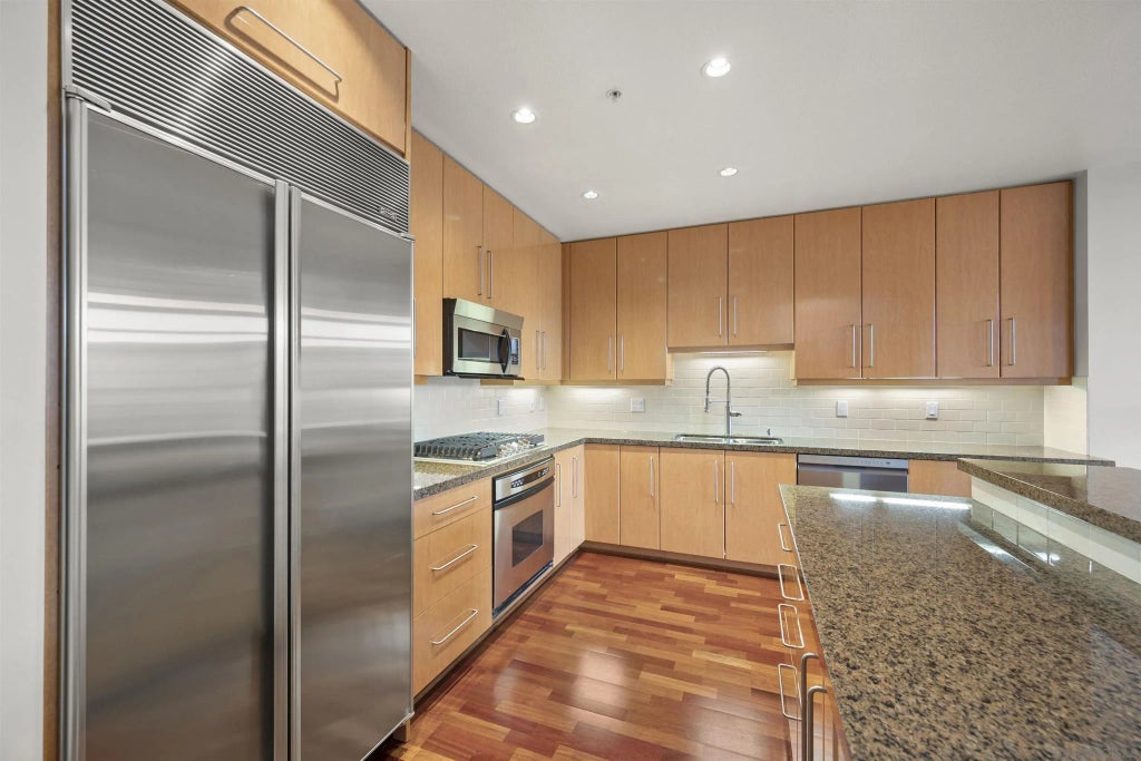 Seize this remarkable opportunity!! Park Place residence 103 is located in the Marina District, where tranquility meets convenience. This residence offers easy access to the waterfront and the renowned Seaport Village Headquarters. The unit boasts 10-foot ceilings, creating an airy and open atmosphere with abundant natural light. Features include hardwood floors, high-end appliances, a spacious pantry, a large patio with direct access to Harbor Drive, a deeded storage unit, and two dedicated parking spaces.