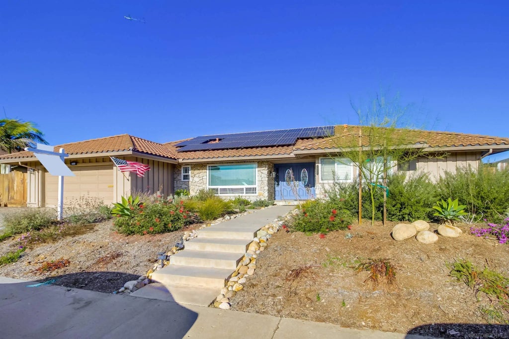 This stunning single-story home is nestled at the top of Fletcher Hills, offering breathtaking canyon and mountain views. The recently renovated outdoor patio is truly an entertainer's dream, featuring a sparkling pool, relaxing jacuzzi, serene waterfall, built-in BBQ, firepit, TV, and a covered seating area perfect for enjoying the vistas in comfort. Plus, the pool is equipped with its own solar system, fully paid for, making it both eco-friendly and cost-efficient. The lush backyard also boasts a variety of fruit trees, adding a touch of natural beauty and providing homegrown delights. Inside, the home showcases a beautifully upgraded kitchen with sleek quartz countertops, custom cabinetry, and modern appliances. Thoughtfully updated lighting and flooring throughout create a fresh, inviting atmosphere. A spacious bonus sunroom offers the perfect space to relax and enjoy the surrounding views, whether as a reading nook, art studio, or simply a quiet retreat. The floor plan also includes an office/den that can easily serve as a fourth bedroom, while expansive picture windows along the back of the home bring the spectacular views right into the living space. Both the master and guest bathrooms have been tastefully updated, ensuring a spa-like experience. Additional highlights include owned solar panels for energy efficiency and a prime location that puts you in the heart of Fletcher Hills. Don’t miss the opportunity to own this unique property—truly a one-of-a-kind gem! This home also has a NEST system.