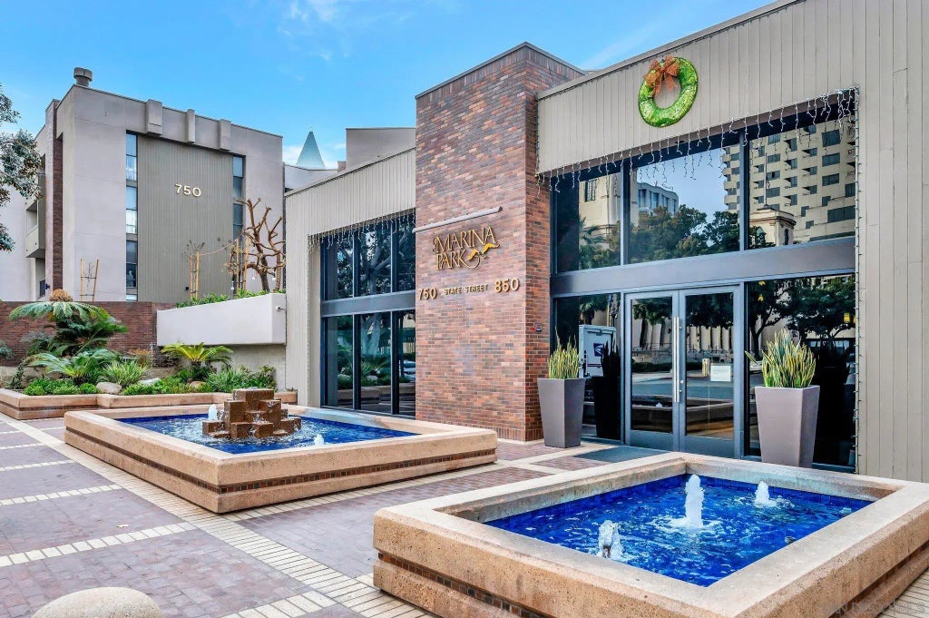 Discover upscale living in the heart of downtown San Diego in the prestigious Marina Park district. This stunning 2 bed 2 bath residence boasts a split bedroom floorplan, offering both privacy and functionality. As you enter the home, you'll be greeted by a spacious living and dining area, perfect for entertaining guests or relaxing after a long day. The warming fireplace creates a cozy ambiance, making it the ideal spot to unwind. The living area features a sliding door that leads to a balcony offering serene views of landscaping, tranquil fountains, and a sparkling pool. It's the perfect place to soak up the sun, read a book, or host intimate gatherings with friends and family. Residents of Marina Park have access to an array of world-class amenities. Take a dip in one of the multiple pools and spas, or break a sweat in the state-of-the-art fitness center. With 24-hour security, you can have peace of mind knowing that your safety is a top priority. The common areas provide additional space to socialize or simply enjoy the beautiful surroundings. For your convenience, Marina Park offers ample guest parking, and also features EV charging stations.