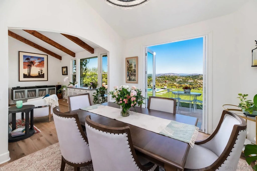 Stunning VIEWS!!! Enjoy breathtaking sunrises and canyon rim mountain views reminiscent of a Tuscan hillside at this magnificent Ranch and Coast Paradise. Delight is this turnkey home with 4 bedrooms, 3 baths, and over $200k in recent upgrades to enjoy a plethora of amenities and a luxurious lifestyle in a gated community, 3 car oversized garage, fully owned solar, ground floor primary suite, private pool and spa!! Nearby golf, surfing, tennis, pickleball, shopping and fine dining. Located within a five-minute drive from the internationally esteemed Rancho Valencia Spa and Resort in Rancho Santa Fe and the Fairbanks Ranch Golf Course. Picturesque views overlooking the Del Mar Country Club and nearby One Paseo shopping, premier restaurants and minutes to put your toes in the sand at the Del Mar beaches. French doors from the primary suite open to your magnificent back yard and provide direct access to your private pool and spa. Wake up in paradise to the sun rising behind your stunning garden just outside your ground floor primary suite which includes a remote-control gas fireplace, automated window coverings, a spacious walk-in closet with built ins, and a skylight ensuite bath with steam shower, bidet, gorgeous newly installed Azul do Mar quartzite from Brazil and a sumptuous secret fountain and passion fruit garden. Newly installed real white oak hardwood floors throughout the home. High ceilings with exquisite wood beams in the living room and lots of natural light throughout the home.