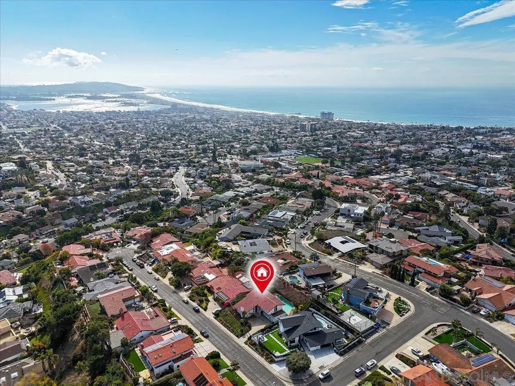 Stunning views, spanning the Bay, Ocean, Downtown, & Corondo Island, all the way to the hills of Tijuana. Prime location, on a quiet cul de sac, just minutes away from renowned restaurants, shops, & attractions of Bird Rock, La Jolla and Pacific Beach. Abundant natural light streams through floor to ceiling windows, illuminating the main living space w/ 2 story, vaulted ceilings. Glass sliding doors open the living space to a private oasis for a true California, indoor - outdoor lifestyle. Spacious patio, yard & gardens overlook the beautiful blue Pacific & beachside neighborhoods. Inviting 9ft, cannonball-ready pool, spa, and built-in fire pit, are ready for outdoor fun. Luscious planting beds and multiple fruit trees, including lemon, lime, apple, orange, stone fruit, and a grape arbor. The open kitchen features a 5-burner gas stove, eat-at-counter, and an abundance of storage space, with the bonus of Southern views as you wash your dishes. The open family room steps directly out to your pool & patio, and features custom wood built in storage and a bar area. Primary bedroom opens to its own sizable decks, one overlooking the pool, and the other with one of the best views on the street, and stairs leading down to the fabulous yard and pool. Spacious vanity and 2 closets with built-ins. Refinished hardwood flooring and new carpet, plus fresh paint throughout. Air conditioning and dual heating. Spacious laundry room with extra storage, leads to the 3 car garage. The third stall has been converted to a workshop. This North PB street is well known for spectacular action views.