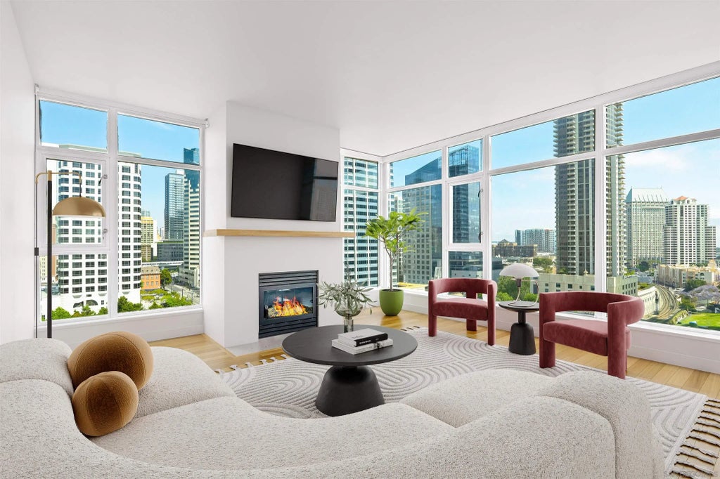 Experience the epitome of urban luxury on the 14th floor of The Grande South. This coveted corner residence showcases breathtaking views of the San Diego Bay and the iconic city skyline. The open-concept design features rich cherry wood floors that flow seamlessly through the bright and airy living space, complete with a cozy fireplace. The dining area offers versatility with ample space for a home office setup, while the private balcony serves as the perfect vantage point to take in the stunning surroundings. This home combines style, comfort, and an unbeatable location. The kitchen features top-of-the-line stainless steel appliances, sleek granite countertops, and ample storage space. Enjoy incredible views from the spacious primary suite, and from every room in this residence! As a resident of The Grande South, you'll enjoy exclusive access to luxury amenities, including a guest suite, a state-of-the-art fitness center, a relaxing pool and spa, a community lounge, and 24-hour concierge service. Located in the prestigious waterfront neighborhood of downtown, this prime location is just a short stroll from trendy shops, cafes, live entertainment and museums. Just a block from the highly anticipated Research and Development District, homes like this will benefit the most. Convenient transportation options are located just outside your door. Close proximity to the Airport and freeways. Don’t miss your chance to invest in one of San Diego's most desirable neighborhoods!