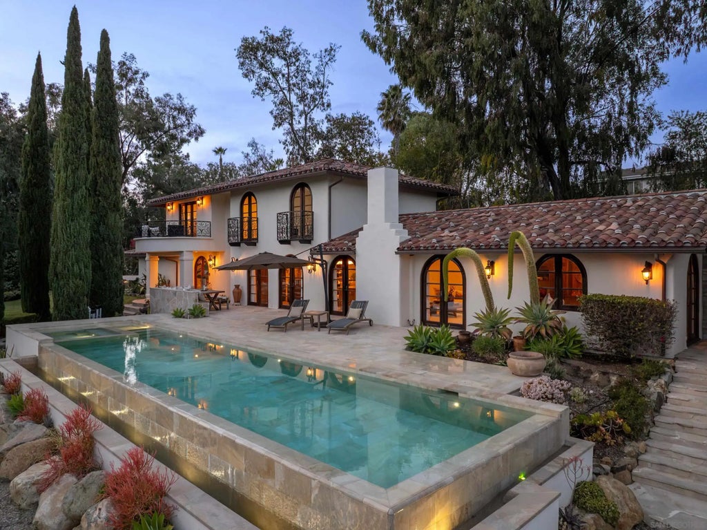 Introducing one of the most private property locations within the highly coveted community of Rancho Santa Fe, featuring a brand new European-tiled lap pool and spa with stunning sunset views. Situated on a sprawling one-acre lot with a level lower lot for a value ad of an ADU, Pickle Ball court, home garden or vineyard with its own access. This Spanish Colonial home offers unparalleled seclusion and expansive outdoor living spaces. Infused with classic old-world charm, the 4-bedroom, 3-bathroom residence was completely renovated during 2003 room additions. Thoughtfully designed, the main level boasts Spanish tile and hardwood plank flooring, a cozy sitting room/library or downstairs guest bedroom. The open floor plan features a tiled grand entry foyer, a gourmet's galley kitchen and dining area, a great room with fireplace, and an intimate lounge connecting to an outdoor kitchen and entertainment BBQ patio. Upstairs, the primary suite exudes timeless elegance, complete with a sitting balcony and serene views. Two additional bedrooms with a shared bath showcase stunning sunset vistas over the pool and surrounding hillsides of Rancho Santa Fe.The property’s appeal is further enhanced by access to the private HOA lake, tennis courts, walking trails and picnic areas, ideal for family gatherings. A large play area on the lower level provides ample space for children or pets, making this retreat perfect for families seeking both luxury and functionality.