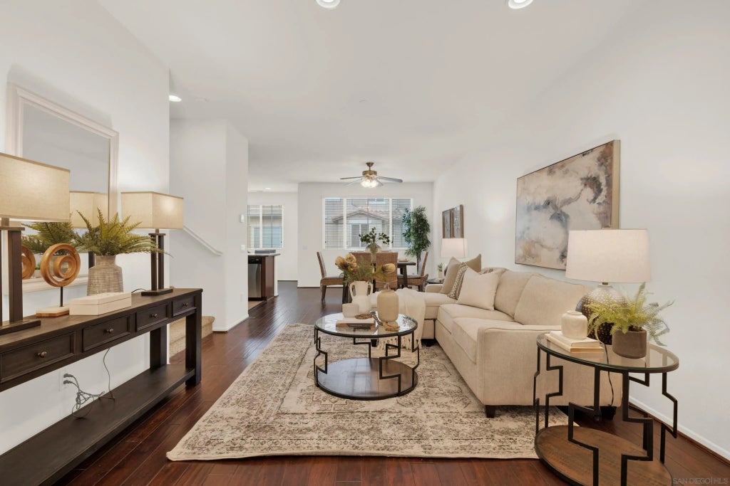 This beautiful, move-in-ready 3-story townhome features 4 bedrooms, 4 bathrooms, & a rare 3-car garage, plus one extra permitted parking space—perfect for large families, multi-generational living, or roommates. Welcome to the sought-after Riverwalk Community in Santee!Nestled along a tree-lined pathway, this home exudes a peaceful vibe, ideal for leisurely strolls. Step inside, & you'll be greeted by high ceilings that create an airy feel. With an east-facing layout, you’ll enjoy morning sunlight that brightens the space. The first floor includes a bedroom with its own en-suite bath, making it an excellent spot for guests.The freshly painted interior boasts new plush carpeting, hardwood floors, & recessed lighting. All closets are mirrored, adding a stylish touch while making the rooms feel even more spacious.The kitchen features elegant walnut cabinets, a cozy breakfast nook, peninsula seating, granite countertops, and SS appliances. It flows effortlessly into the living areas and balcony, where you can fire up the grill and enjoy barbecues with friends & family. You’ll love the master suite, which includes a walk-in closet & a spacious bathroom with a tub. Step outside to relax on your inviting porch facing the greenbelt—perfect for soaking up the lovely San Diego weather. Laundry room is located next to the garage. Walking distance to schools & the YMCA & Town Center Community Park just across the street. Sportsplex, parks, shopping, freeways, & restaurants are all close by. This beautifully maintained home, owned by its original owner, reflects true pride of ownership!