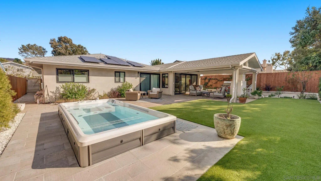 This stunning coastal Del Mar home boasts over $400,000 in upgrades and is designed for seamless indoor-outdoor living, with every detail carefully considered. Perfectly located west of the 5, this single-level home offers a rare blend of luxury, comfort, and convenience—and can even be sold fully furnished for a truly move-in-ready experience. The expansive living room is the heart of the home, effortlessly opening to the beautifully upgraded backyard, creating an indoor-outdoor oasis. Enjoy year-round entertaining under the custom patio cover, complete with a built-in fireplace, BBQ area, and custom blinds for shade and privacy. The built-in spool (pool/spa) is low-maintenance and always warm, offering a private retreat just steps from your door. Inside, the amazing chef’s kitchen is a dream, featuring high-end appliances, custom cabinetry, and premium countertops. The spacious primary suite is a sanctuary, with direct access to the backyard, bringing in natural light and fresh coastal air. Throughout the home, thoughtful upgrades and designer touches elevate every space. Additional highlights include a new roof, upgraded 200-amp electrical panel, owned solar system, New A/C system, and a new Tesla charger for modern convenience. The exterior is just as impressive, with new pavers and lush landscaping adding to the home’s curb appeal. Located just minutes from freeways, shopping, and the sand of Del Mar Beach, this is a true turnkey home, offering luxury, attention to detail, and the ultimate coastal lifestyle. Don’t miss this exceptional opportunity!