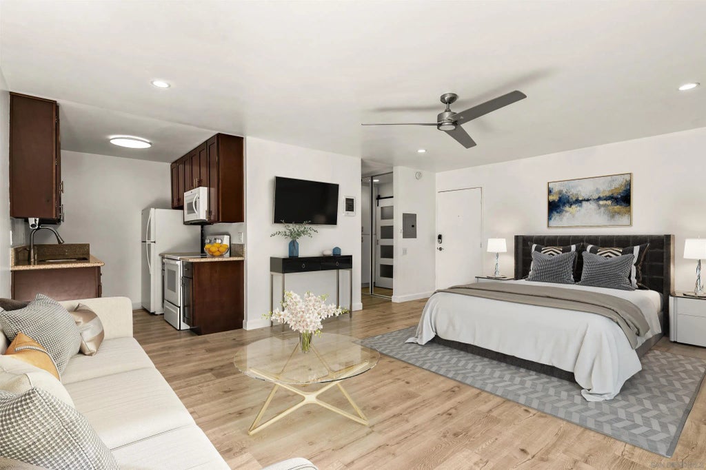 Opportunity knocks with this sun drenched studio in Pacific Beach! Spacious, turnkey, ground level corner unit with west facing views of the sunset and tropical lagoon. This beachside condo features a private patio with sliding glass door, updated laminate flooring throughout, full size refrigerator, dishwasher, stove and microwave. Ample storage within the unit as well as one designated secured parking space. Best priced studio in all of 92109, with unlimited access to all of PB's amenities including world class beaches, boardwalks, dining, shopping and cafes. The Plaza offers a wealth of resort-style amenities, including swimming pools, hot tubs, a fitness center, tennis courts, a billiards room, a lounge, BBQ areas, and a 24-hour on-site attendant.
