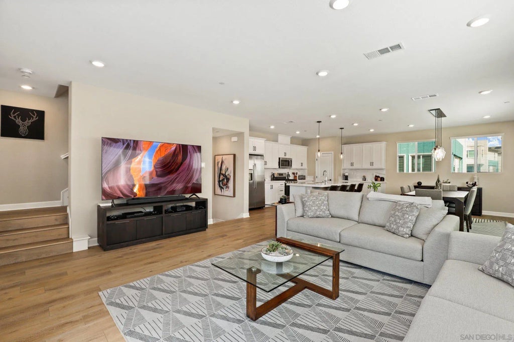 BEST LOCATION IN COMPLEX! Experience the best of urban living in the vibrant Millenia community, where parks, promenades, shops, dining, and more are just steps away! This stunning west-facing 4-bed, 3.5-bath CORNER tri-level rowhome with views to open space. The first floor features a full bedroom and bath, perfect for guests or multi-gen living. Inside, enjoy luxury vinyl plank flooring, designer light fixtures, and an open-concept living space filled with natural light. The chef’s kitchen boasts a large island, sleek white cabinetry, quartz countertops, custom backsplash, and stainless steel appliances. Upstairs, the primary suite impresses with a spacious walk-in closet and a spa-like en-suite featuring a soaking tub and dual vanity. Additional highlights include an in-unit laundry, a finished 2-car garage with epoxy flooring, an EV charging outlet, and PAID SOLAR for energy efficiency. Resort-style amenities include a sparkling pool, spa, and playgrounds. Located just across from Otay Ranch Town Center, with exciting restaurants, plus easy access to Otay Lake and scenic trails—this is modern living at its finest!