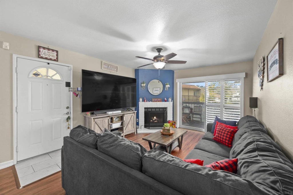 SELLER WILL ENTERTAIN OFFERS BETWEEN $449,850-$489,850. SELLER WILL PAY THE BUYER'S HOA FEE FOR ONE YEAR! VA Approved complex! Welcome to your starter single level, end unit home at Villa Bonita. Perfect for the first-time homebuyer or as a rental investment. This charming property boasts 2 bedrooms, 2 modern bathrooms, and wood-like flooring throughout. The heart of the home features a beautiful kitchen with granite slab countertops, rich dark wood cabinets, and stainless steel appliances. Upgraded bathrooms with stylish fixtures. Indoor stackable washer & dryer which conveys with the property. Enjoy the wood burning fireplace or step outside to the outdoor patio—an extended living space perfect for entertaining or relaxing. Each room is equipped with ceiling fans to keep you comfortable year-round, and horizontal window blinds offer both privacy and light control.With two dedicated parking spaces, a tennis court, a swimming pool, a spa, and a secure gated community, this home has all the amenities you need for a comfortable lifestyle. Refrigerator, washer, and dryer convey