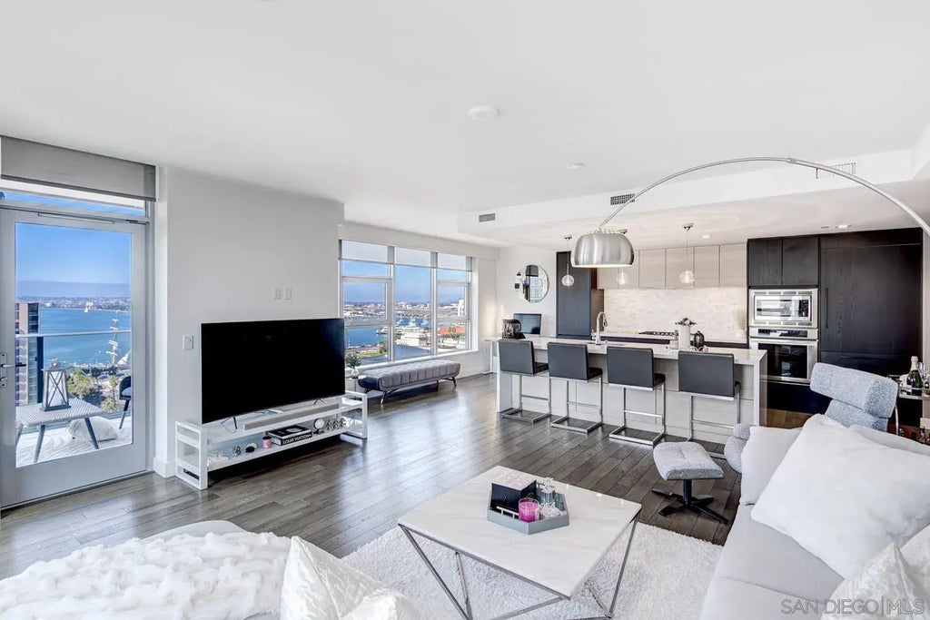 Experience luxury living at Savina, one of Bosa's premier properties! This highly desirable southwest corner unit features stunning bay and downtown views. The 2-bedroom, 2-bathroom layout boasts a modern design with upgraded hardwood flooring, large windows that offer views from every room, European-style cabinetry, a spacious island with a waterfall edge, Thermador appliances, custom lighting, and motorized shades with smart controls, including blackout shades in the bedrooms. Walk in closet in the primary bedroom. Enjoy the spacious bathrooms with glass-enclosed tile showers and a generous tile-covered balcony. 5- star amenities, Pool, Gym , Sauna, private dog area bbq and an amazing club room with pool table and big screen TV. Unit comes with 2 parking spaces and a private storage locker.