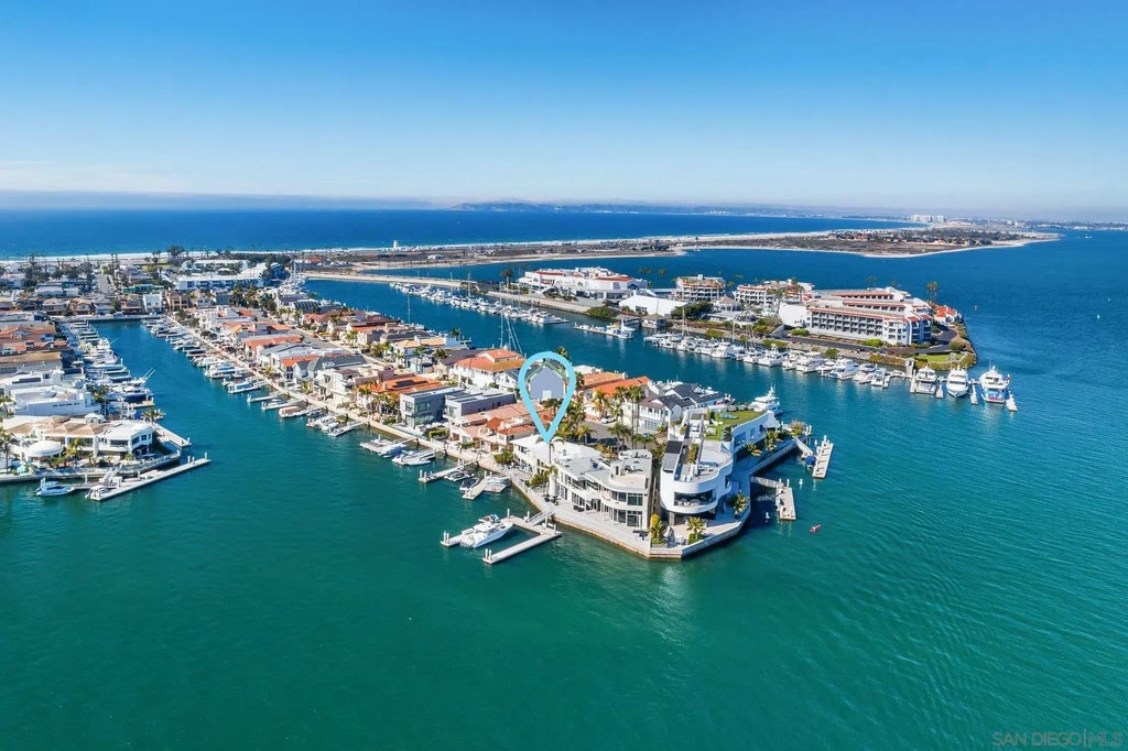 Located at the very tip of The Point, this lovely wide expansive home is a rare find in the Cays. The south facing waterfront wrap-around patio opens up onto beautiful San Diego Bay with your own private boat dock. Enjoy amazing wide open water views of sail boats, yachts and wildlife from every room in the house. A breathtaking entry greets you with tall cathedral wood beamed ceilings, large, picturesque windows, a majestic fireplace, a large formal dining area and an elegant spiral staircase. The large modern kitchen includes a walk-in pantry, eat-in dining area with direct access to the patio for summer barbecues. A large center counter with extra storage accompanies a big Sub-Zero fridge, Monogram double ovens, warming drawer and a 5 burner cook top. The welcoming guest bedroom has wonderful sliding glass doors that take you outdoors to a separate a very pleasant sitting area. Upstairs is a luxurious primary retreat with stunning views from the lovely balcony. A private den/sitting area with wine/coffee bar and balcony adjoin the primary bedroom with a separate door offering privacy when you choose. The primary ensuite includes his & hers separate vanities, a large Jacuzzi spa tub, a couples' dry sauna and a huge walk-in closet. The upstairs back bedroom is complete with its own private outdoor balcony and lovely ensuite bathroom. A single car garage and a recently remodeled 2-car garage are the icing on the cake!