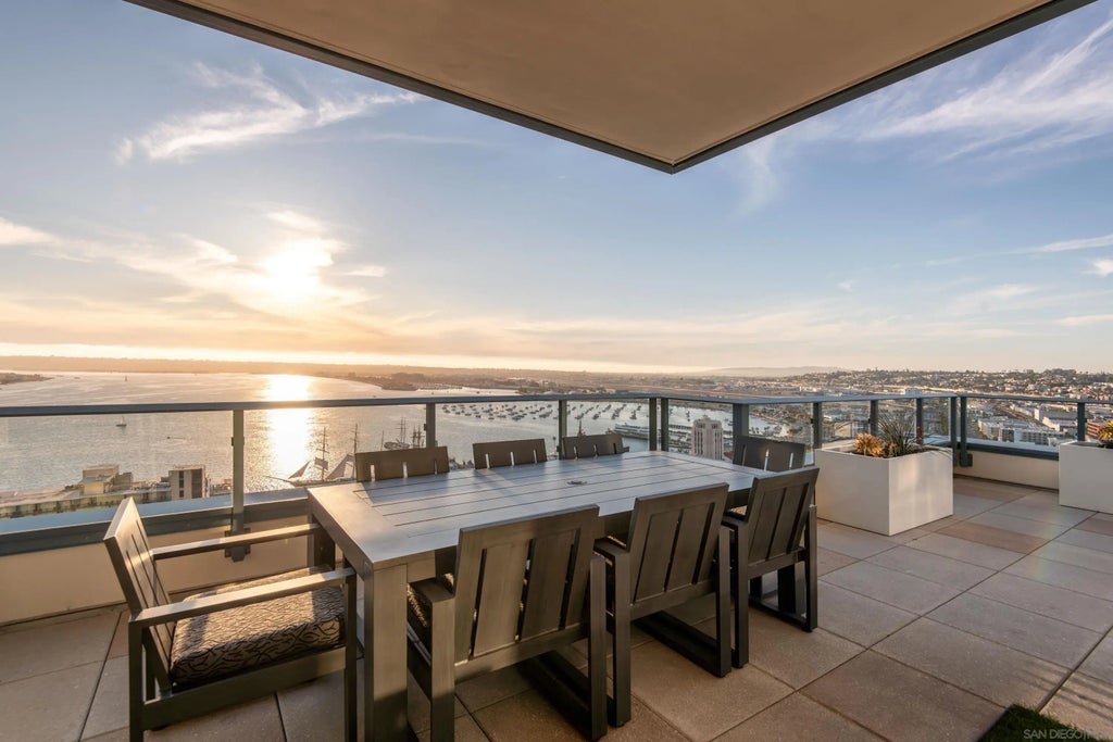 Waiting for "The One"? The wait is over! This spectacular, one of a kind residence in the BEST location with one of the largest balconies is now available. Residence 2501 offers unstoppable and unblockable views of San Diego Bay, Pt Loma, Airport, Uptown and downtown lights. Relax on over 1000sq ft of deck space and entertain family and friends in style. The Primary bedroom features a huge walk-in closet, en suite bath with marble tiles and walk-in shower. the 2nd bedroom also has a walk-in closet and the same stunning views. Upgrades include designer wallpaper, remote blinds and hardwood floors throughout. Parking is side by side and storage included. Savina amenities are some of the finest in all of downtown and the proximity to the waterfront, Little Italy, restaurants and entertainment is only steps away.