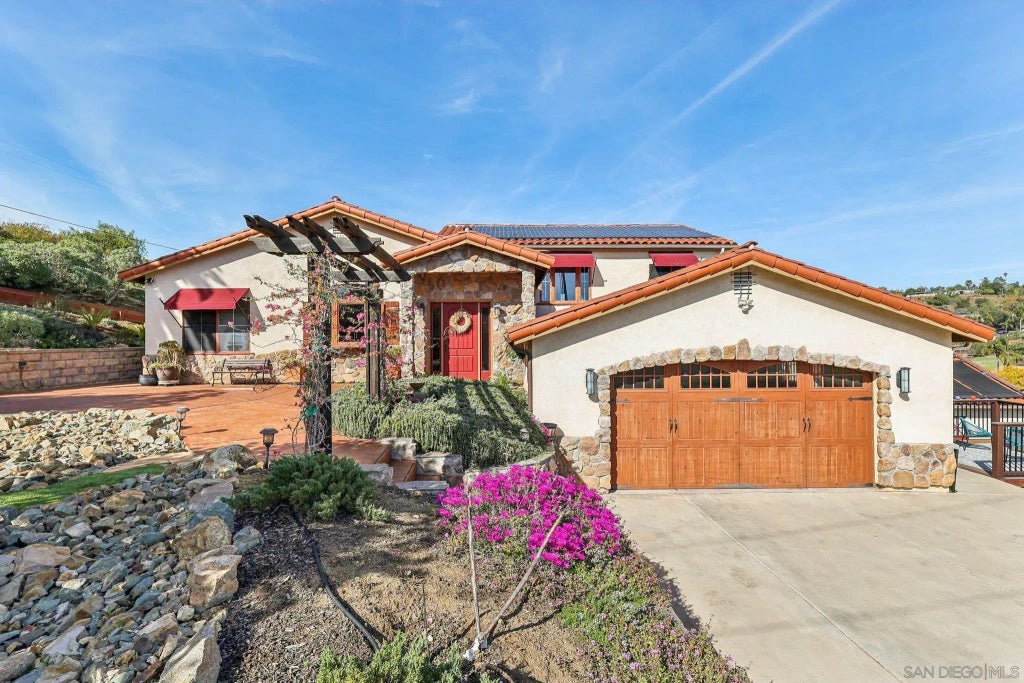A Private Spanish-Style Oasis in Vista. This home is thoughtfully curated inside and out. Exposed brick, terra cotta tile, and natural light create warmth and character throughout the home. From the newly renovated kitchen, to the open floor plan that allows for effortless entertaining. French doors off the dining room open wide to a beautifully landscaped private yard with BBQ, creating a true indoor-outdoor living experience. A full bathroom and a flexible 5th bedroom or office complete the main level. Up half a flight of stairs, you’ll find three newly renovated bedrooms. This level also includes a secondary living area or playroom. A hidden attic bonus room provides additional storage or a charming play space. Down half a flight of stairs, the primary suite offers a tranquil retreat, complete with a spacious bedroom with two large closets and a picturesque window, a private ensuite bathroom, and a flexible living area or office space with a wood-burning fireplace. A laundry room and attached two-car garage complete the lower level. Set on a private half-acre lot, this home features a stunning saltwater pool with a gazebo, firepit, and BBQ, as well as a Trex deck with hot tub hookups. RV/boat parking and a detached 2+ car garage offer additional storage, a home gym, or even potential for an ADU conversion. Home includes solar panels, EV hookup, solar pool heating, and newly installed A/C. This home is just 15 minutes from the beach and some of North County’s best restaurants. Conveniently located minutes from downtown Vista, Trader Joe’s, Target, and the 78 Freeway.