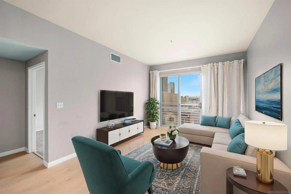 Reimagine city living in this quiet, interior west-facing residence in Gaslamp City Square, where serene views of the tranquil pool and the city skyline await you. This unique one-bedroom features a versatile den with a built-in Murphy bed/desk, making it ideal for guests or a home office. The open-concept kitchen boasts upgraded LG stainless appliances, large single basin sink, under cabinet lighting, and a designer light fixture illuminating it all. The primary bedroom offers large windows taking in the sunlight and views, an organized walk-in closet, and with upgraded faucets and fixtures. Enjoy features such as sleek bamboo flooring, motorized window shades, an integrated Nest system, and a secured parking space. Looking for a smart investment or a trendy downtown escape? This residence is the ultimate choice for city enthusiasts. Immerse yourself in the lively atmosphere of the Gaslamp Quarter!
