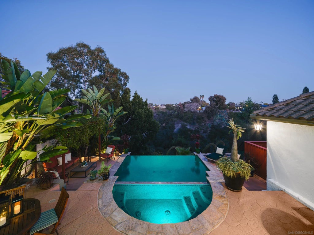 Nestled along one of Talmadge’s most picturesque and historic streets, this enchanting Spanish-style sanctuary is a timeless fusion of old-world romance and modern refinement. Spanning 1,546 square feet, this three-bedroom, two-bathroom retreat is a masterpiece of character and charm, where hardwood floors, graceful archways, and sun-drenched interiors evoke an effortless elegance. Designed to embrace Southern California’s signature indoor-outdoor lifestyle, the home is perfectly positioned along the canyon’s edge, offering a serene escape immersed in breathtaking natural beauty. A true celebration of outdoor living, the residence boasts three captivating patios, two of which provide a front-row seat to the infinity-edge saltwater pool and spa, cascading into the lush canyon below. Whether enjoying a tranquil morning as the sunlight filters through the trees or an evening under a sky ablaze with color, these enchanting spaces offer a setting of pure magic. Inside, the spacious living room exudes warmth and sophistication, with its gas fireplace, coved ceilings, and exquisite architectural details that add to its inviting ambiance. A formal dining room, perfect for intimate gatherings, is complemented by a charming breakfast nook, bathed in morning light, which offers a cozy spot to savor a quiet moment.