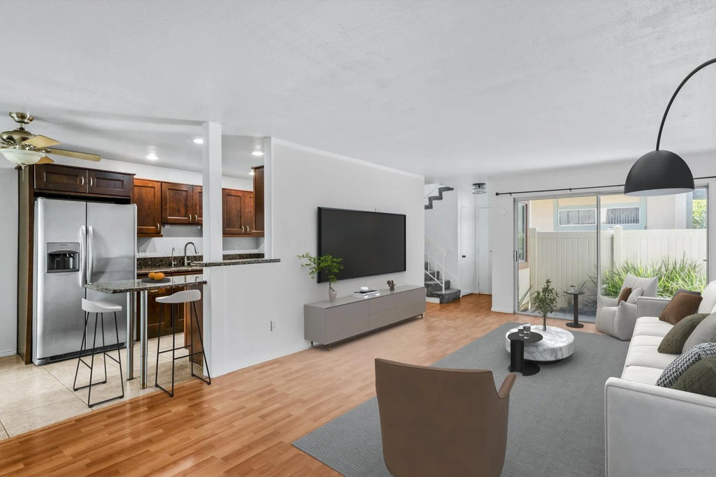 Prime Location & Modern Upgrades + VA approved! Nestled in the highly desirable Birdland neighborhood, this beautifully remodeled end-unit townhome offers 1,336 square feet of light-filled living space with only one shared wall and no neighbors above or below! Step inside to an open layout, fresh paint, and hard surface floors, creating a bright and inviting atmosphere. The upgraded kitchen boasts granite countertops, modern cabinetry, stainless steel appliances, reverse osmosis water filtration system, and a stackable washer/dryer for added convenience. Additional upgrades include new windows, carpet, sliding glass door, and updated light fixtures. Enjoy the luxury of multiple outdoor areas, including a front patio, spacious back patio, and a large new balcony off the primary suite perfect for relaxing or entertaining. Some photos are virtually staged to help visualize the space. A full-size covered carport with ample storage adds to the home's convenience. As part of a well-maintained community, residents have access to a sparkling pool and clubhouse for leisure and social gatherings. Just minutes from Fashion & Mission Valley, Trader Joe's, major hospitals, top schools, and easy access to freeways, beaches, Downtown and more. Pet-friendly HOA and neighborhood! Move-in ready offering the perfect blend of modern upgrades, prime location, and effortless comfort. This unit is a must-see!