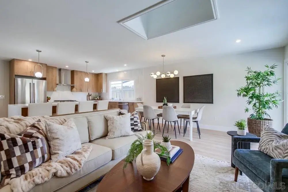 Nestled in the desirable Serra Mesa neighborhood, this beautifully remodeled 4-bedroom home seamlessly blends modern sophistication with suburban comfort. Featuring brand-new windows, furnace, A/C, and flooring throughout, every detail has been carefully considered. A grand vaulted entryway opens to an expansive, open-concept living area, where the kitchen, dining, living, and backyard flow effortlessly together. The chef-inspired kitchen boasts top-of-the-line appliances, custom cabinetry, quartz countertops, and a stylish center island—perfect for both meal prep and entertaining. The luxurious primary suite is a true retreat, complete with designer tile and fixtures for a spa-like experience. Step outside to a spacious patio area, ideal for al fresco dining and enjoying the California sunshine. Situated in a highly sought-after neighborhood centrally located to parks, and easy access to shopping and dining, this home offers both comfort and convenience.