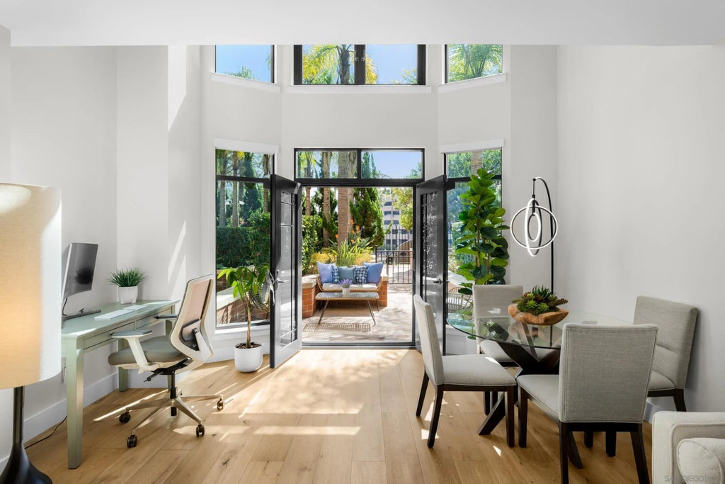 Nestled within one of downtown San Diego’s most prestigious addresses, this rarely available south-facing townhome at CityFront Terrace embodies refined luxury and effortless sophistication. Located within one of the most expertly managed residential buildings in the city, this distinguished home offers not only timeless elegance but also the exceptional service and meticulous management that discerning homeowners expect. Recently remodeled and freshly painted, this exquisite ground-level residence showcases soaring 15-foot floor-to-ceiling windows that bathe the interiors in natural light, creating an ambiance of openness and grandeur. Meticulously curated with the finest finishes, the home features European oak floors that lend warmth and sophistication, while sleek modern cabinetry and quartz countertops with a striking waterfall edge elevate the kitchen’s contemporary appeal. Designed for both function and style, the chef’s kitchen is appointed with Bosch stainless steel appliances, a five-burner gas cooktop, soft-close cabinets and an undermount single-basin sink. A thoughtfully integrated built-in bar area enhances the space, making it as ideal for entertaining as it is for everyday living. The primary suite is a sanctuary of comfort, offering a spacious walk-in closet and an opulent en-suite bath with dual vanity sinks, a glass-enclosed shower, and a luxurious jacuzzi bathtub. The additional powder room is equally refined, featuring a modern floating vanity that adds a touch of contemporary sophistication.