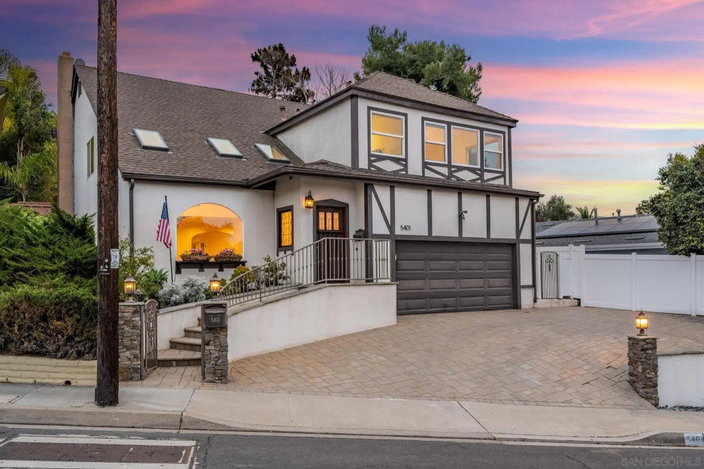 Welcome home to the Tudor on La Jolla Mesa! Enter into a formal living room with tons of natural light from oversized windows and skylights above. An eclectic mix of style with walls of Santa Barbara-style silky smooth finish, modern tall baseboards, and rustic real wood floors that add warmth to every room. An entertainer's dream kitchen with tons of counter space, abundant storage, and newer high-end appliances. Adjacent to the kitchen is a wonderful family room, anchored by a gas fireplace that is perfect for those cozy winter nights in. This versatile floor plan home features four spacious rooms upstairs—3 bedrooms plus an office or guest room—and two updated bathrooms with a convenient 1/2 bath downstairs. The primary suite is a sight to see, with panoramic white water views, a beautifully remodeled primary bathroom, and a walk-in closet. Step outside into your wonderfully appointed backyard via French doors. The perfect outdoor space with a built-in fireplace as well as a full outdoor kitchen with a gas grill and a Big Green Egg smoker. Climb to the upper property line for even more panoramic ocean views! Summer parties and holidays will be unforgettable in this La Jolla home. Going outside your home, you are adjacent to the Bird Rock neighborhood, the best shopping, wonderful restaurants, and world-famous beaches.