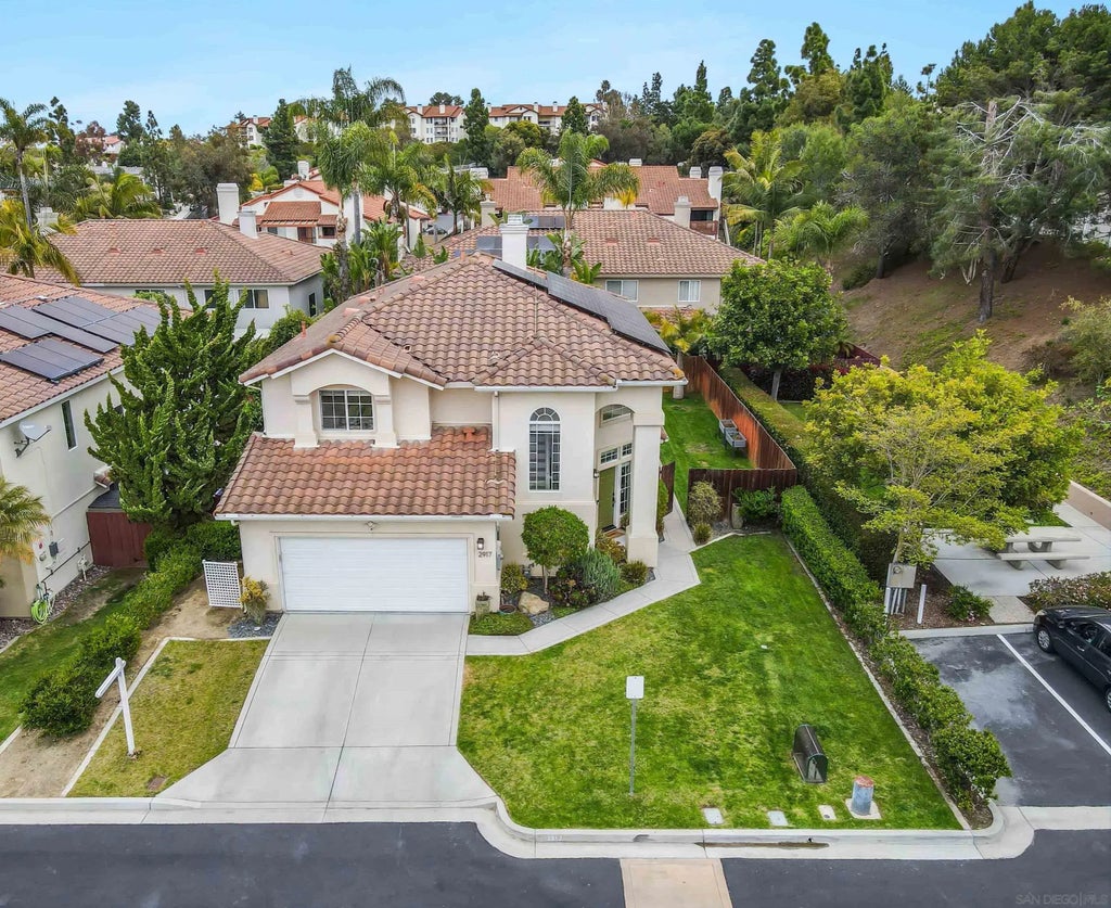Welcome to this beautiful detached home in the highly sought-after Regency community of La Costa. Nestled on a quiet cul-de-sac next to the Tot Lot, this light-filled residence offers privacy, sophistication, and a seamless layout with an expansive first-floor primary bedroom and owned solar. Impressive two-story ceilings, gorgeous new LVP flooring, and high-placed windows with motorized shades enhance the open-concept living and dining areas, complemented by an updated fireplace and a stylish dry bar with a beverage fridge. The home has been thoughtfully upgraded with new solid core wood doors, casing, and baseboards, new recessed lighting, and an upgraded electrical panel. The main-level primary suite boasts tray ceilings, sliding glass doors to the private backyard, and a spa-like, recently renovated ensuite featuring dual sinks, a soaking tub, a walk-in shower, and a custom closet system. The updated eat-in kitchen includes Granite countertops, a gas cooktop, and a cozy breakfast nook with backyard access. Upstairs, three spacious bedrooms share a full bath with dual sinks. Additional highlights include a whole house fan, a full-sized laundry room with a washer and dryer, a whole-house water filtration system and softener, and a tankless water heater. The private backyard offers lush grass and an inviting open patio, perfect for year-round enjoyment. With low HOA dues and no Mello-Roos, this home is ideally located just minutes from La Costa Meadows Elementary, shopping plazas, Alga Norte Park, and stunning beaches.