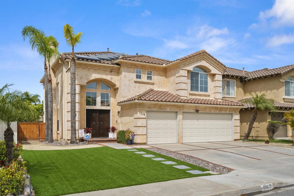 Welcome to this exquisite 4-bedroom, 3-bathroom home, 3 car garage, Pool, jacuzzi, solar panel. From the moment you arrive, you'll be captivated by the beautifully designed landscaping featuring faux grass, crushed granite and custom entry door. Step into a grand entrance with vaulted 20+ ft. ceilings that enhance the spacious feel of the formal living room, complete with a Florence fireplace mantel. The first floor boasts gorgeous wood-look porcelain tile, an abundance of natural light, and neutral-tone paint for timeless appeal. The formal dining room also features vaulted ceilings, creating the perfect space for entertaining. Designed for flexibility and comfort, this home includes a *convenient downstairs bedroom and full bathroom*. The open floor plan seamlessly connects the kitchen, dining area, and family room, making it a dream for both everyday living and hosting. The gourmet kitchen showcases granite countertops with half bevel edge, full backsplash, stylish pendant lights, and ample cabinet space, stainless steel appliances. The cozy family room features its own Florence fireplace mantel. A beautifully crafted *wood spiral staircase* leads you to the second floor, where ceiling fan lamps and plantation shutters provide comfort throughout the home. The *spacious primary suite* is a true retreat, offering an extended walk-in closet and a recently upgraded en-suite bathroom with a ceramic tile shower and tub, new plumbing fixtures, double sink vanity, and tile flooring.Saltwater pool with three water fountains, pebble tech floor. See supplement for more features.