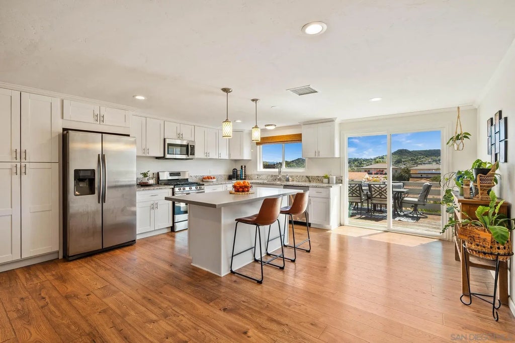 Welcome to this beautiful, move in ready home in west Santee. Featuring large open living spaces, beautiful views from the yard and so many upgrades. From the moment you walk into the home, you will see the pride of ownership. Custom paint and wall paneling, beautiful LVT floors throughout and a huge open living room. You will love the large kitchen and dining space, perfect for entertaining with white shaker style cabinets, quartz countertops, stainless steel appliances and an island for extra seating and counter space. Off the kitchen is the backyard with amazing views of mission hills and beautiful sunsets in the evenings. Both the front and backyards feature turf for easy maintenance and drought resistant landscaping. There three bedrooms 2 bathrooms all with lovely finishes and a 2 car garage. Current owners added a whole new HVAC system (2023), paid off solar (2022) a new electrical panel (2022) and all new insulation in the attic. They also expanded the footprint of the kitchen to add pantry cabinets and replaced the floors LVT throughout.