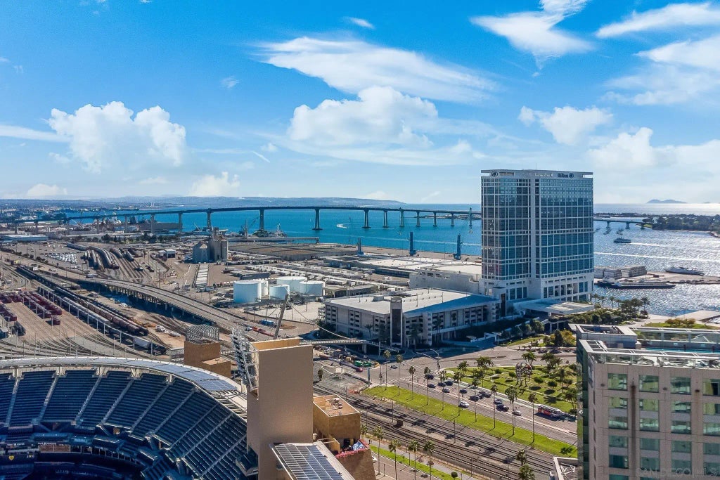 Welcome to your urban oasis in the heart of East Village at The Legend. This stunning 2-bedroom, 2-bath condo boasts a southwest-facing balcony, offering breathtaking views of incredible sunsets, fireworks, and the vibrant skyline of downtown, all with direct line of sight to Petco Park and the beautiful Coronado Bay. Step inside to discover a beautifully updated kitchen, featuring elegant waterfall quartz countertops, a stylish designer backsplash, high-end cabinetry, a farmhouse sink, and a gas range, complimented by top-of-the-line stainless steel appliances. The open layout is enhanced by rich wood flooring and ample storage, making this space both functional and inviting. This modern complex provides a wealth of amenities, including 24/7 security, a fully-equipped gym, a refreshing pool, relaxing sauna and spa, and a rooftop deck perfect for entertaining or relaxing while soaking in the stunning views into Petco Park ideal for concerts and ball games. For your convenience, the unit includes one assigned underground parking space, a motorcycle spot, and a storage locker. Don't miss your chance to experience downtown living at its finest! Schedule a tour today and make this exceptional condo your new home.