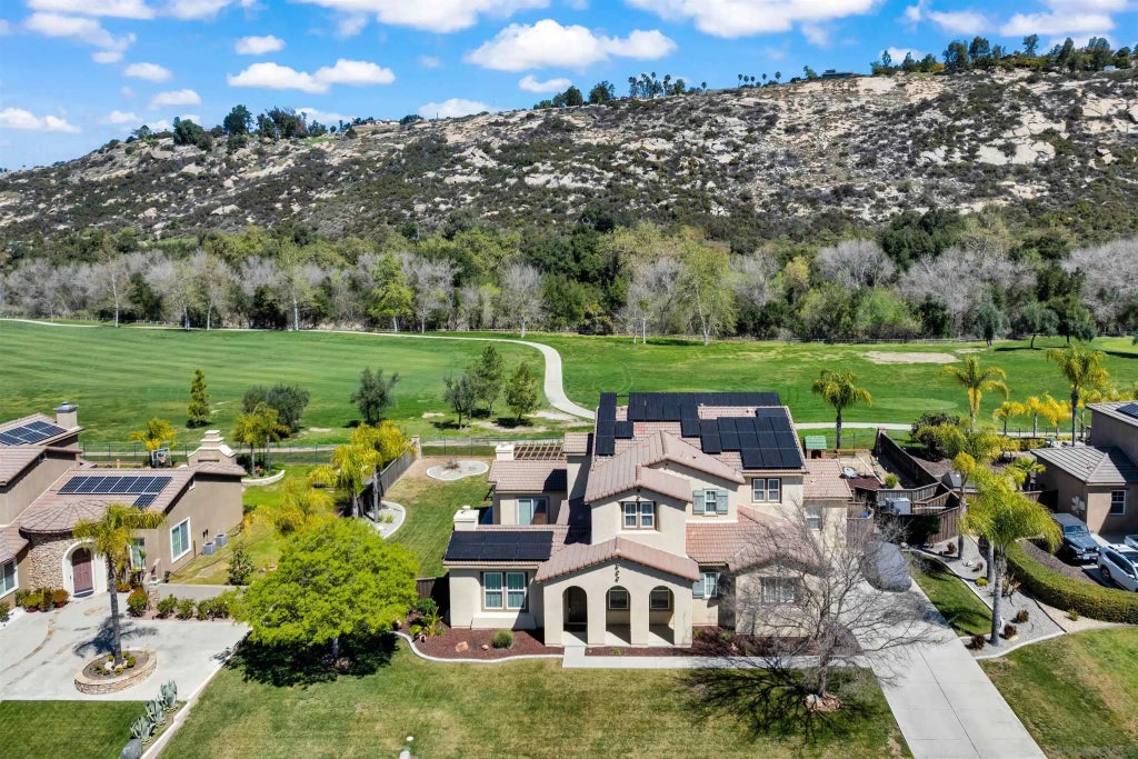 This is an absolutely stunning 5-bedroom, 4-bath home in a desirable golf course community in Valley Center. The beauty of this one is it's backing onto the golf course that also features a picturesque rocky hillside backdrop. Created with comfort and entertainment in mind, the backyard features a built-in BBQ island, a cozy fire pit, and a play structure—perfect for family fun and outdoor gatherings. Now for the interior - soaring ceilings, spacious living areas provide plenty of room for relaxation and the open kitchen design is ready for your culinary creations. With 36 paid-off solar panels, tankless water heater, and whole house fan, energy efficiency is built into the home. Enjoy the tranquility of golf course living while being just minutes from local amenities. Don’t miss this exceptional opportunity!