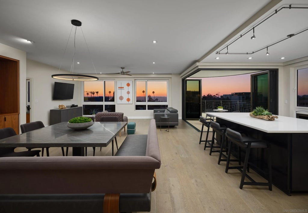 Nestled in the heart of prestigious Bankers Hill, this exquisite sub-penthouse at Vue on 5th embodies the pinnacle of mid-century modern luxury. Designed for those who appreciate refined elegance and seamless indoor-outdoor living, this residence offers breathtaking sunset views stretching over the San Diego Bay. Dramatic LaCantina bi-fold corner doors seamlessly open to a spacious terrace, transforming the living space into an open-air sanctuary—perfect for hosting intimate gatherings or sophisticated soirées. The great room boasts soaring 9-foot ceilings, further enhancing the home’s sense of openness and grandeur. The interior is a masterful composition of warmth and sophistication, featuring custom walnut built-ins, recessed art lighting, and a light-filled open floor plan that feels both expansive and intimate. At the heart of the residence, the chef’s kitchen is a striking blend of function and artistry, outfitted with a Wolf oven, sleek Bosch appliances, pristine quartz countertops, and dual temperature-regulated wine fridges—perfect for the entertainer at heart. Every detail has been thoughtfully curated to enhance the home's effortless flow, from the striking architectural lines to the abundant natural light that floods each space.