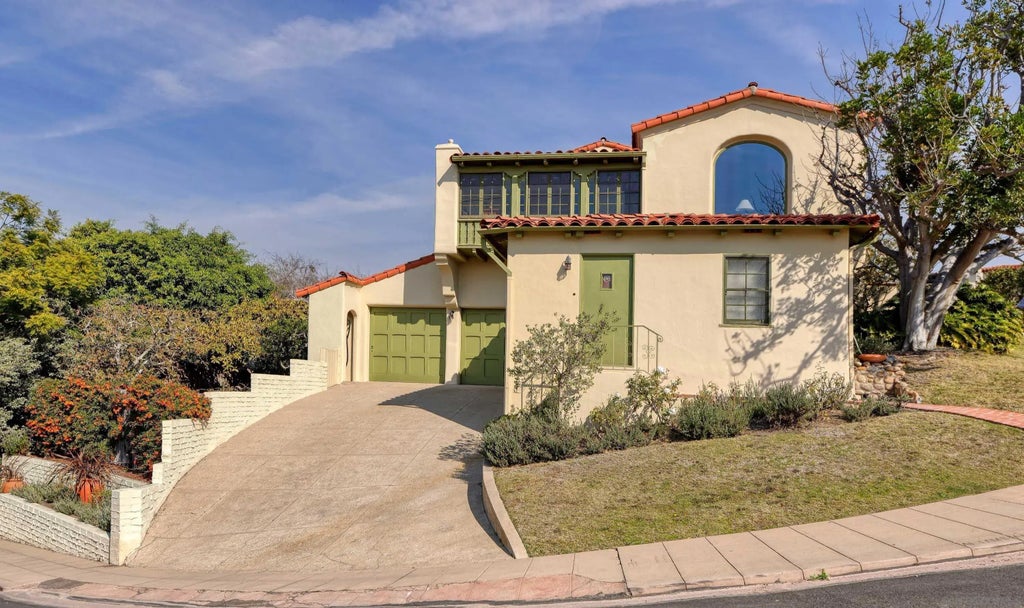 Classic Spanish in the heart of Mission Hills offers panoramic water views and proximity to Presidio Park. Charming interior features hardwood floors, vaulted beam ceilings and arched windows. Entry level includes formal living and dining areas, guest bath, spacious family room and ensuite primary. Additional rooms afford options for home office or gym. Downstairs floor plan includes 3 bedrooms with shared baths. Outdoor terrace invites entertaining and relaxation. Two car garage.