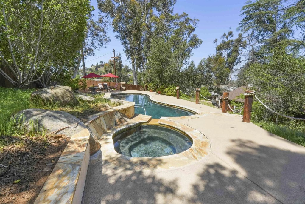 NEW PRICE ADJUSTMENT. Stunning Split level El Cajon Retreat with Panoramic Views & Private Oasis. Located on a private road, Perched high above the charming neighborhood of El Cajon, this unique split level home offers unique scenic views from every level. Spanning 2,622sqft, on over half an acre, this 4+ bedroom, 3 bathroom retreat combines character, functionality, and tranquility in one exceptional package. Step into the home where you’ll be greeted by rich woodwork and an open, inviting layout including both living and family rooms with view(s)! The beautifully curved dining room boasts 180-degree views, making every meal feel like a special occasion. A separate living room showcases sweeping northern vistas through large windows that flood the space with natural light. An additional office or craft room on the main floor gives you the flexibility to make the space your own. Retreat to the outdoors via multiple access points, a long, private driveway leads to potential RV parking and a secluded backyard paradise. The gorgeous pool/spa and cozy gas fire ring are tucked naturally among rocks and pines, offering total relaxation and privacy. A wood deck provides the perfect setting for outdoor dining or entertaining. Additional patio/bbq area also located on main level of house. Interior highlights include over $18K invested in premium flooring upgrades. Conveniently located with quick highway access, this one-of-a-kind home is the perfect blend of peaceful seclusion and easy connectivity.