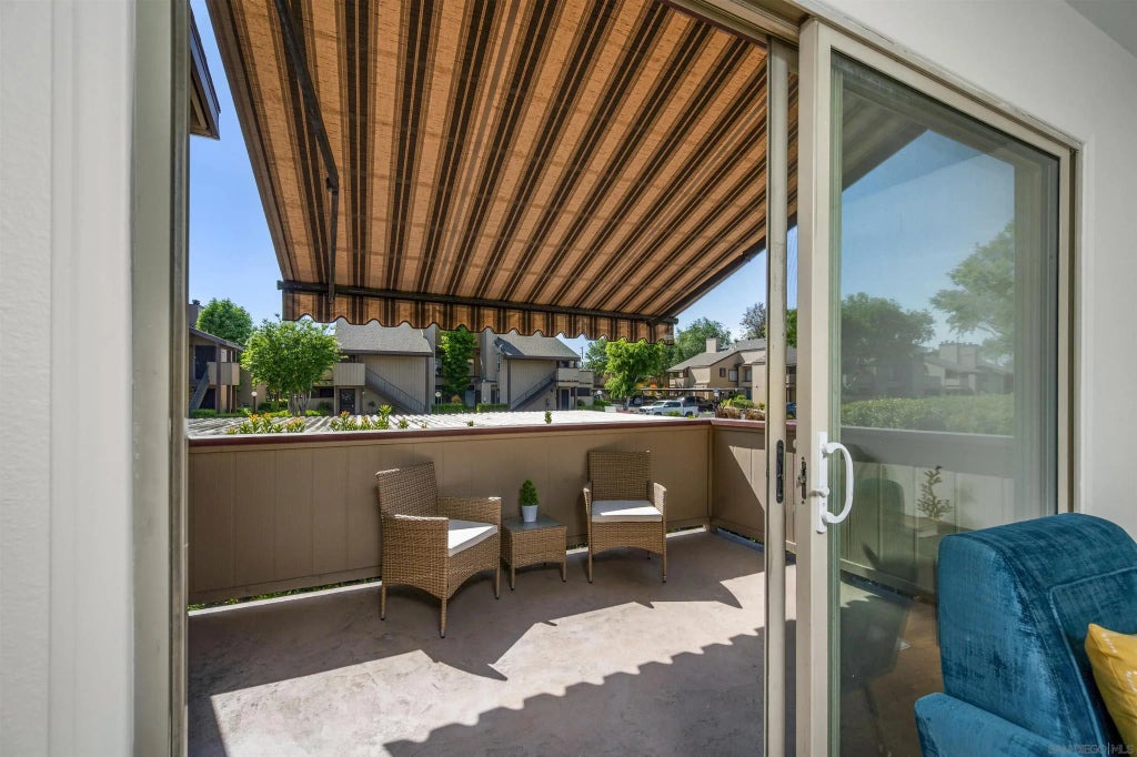Great deal on this updated home in College Grove Village! Ideal split-bedroom layout with two full baths. Newer central A/C & heat, vinyl windows, fresh paint, new carpet, ceiling fans, updated lighting and fixtures. Bright and airy with a large patio and retractable awning. Stainless steel appliances and full-size washer & dryer convey. Quiet, well-kept complex with plenty of parking. Super close to shopping and freeway access!