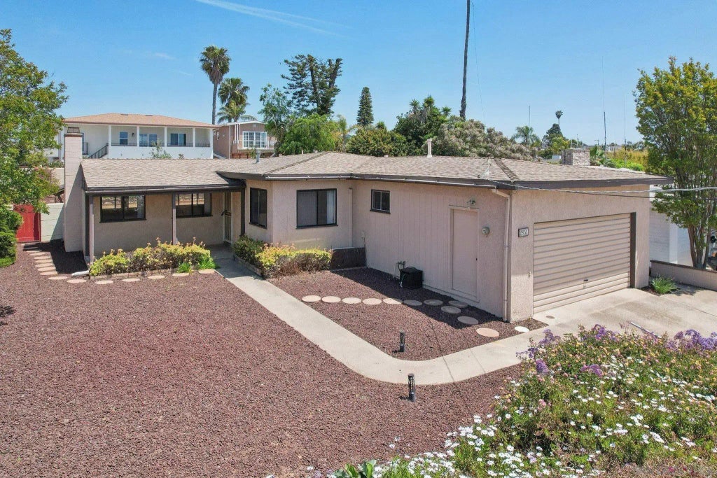 Bring your inspiration and creativity to reimagine this property, situated above street level on a spacious 7,800 SF lot, this home presents an opportunity to update and customize in a sought-after neighborhood. A second-story addition could capture panoramic water views. The single-level floorplan features an open concept living room with original parquet flooring and fireplace and sunroom. Large open kitchen with breakfast bar, ample cabinet space and adjacent dining area. Three bedrooms plus a versatile bonus room provide options for a 4th BR, home office or guest space. The oversized backyard with large patio ideal for outdoor living and entertaining. Drought tolerant landscaping with over 20 varieties of mature plants and shrubs, including Chinese elm, asparagus fern, crimson bottlebrush and many more. Interior features include ample storage with multiple hall closets and linen cabinets. Mini-split units service the living room and one bedroom. The two-car garage has a provides additional storage space and has a 220 outlet. Clairemont Village is a short stroll away, offering various stores, restaurants, and services such as Sprouts, Starbucks, specialty shops, and eateries for everyday essentials.