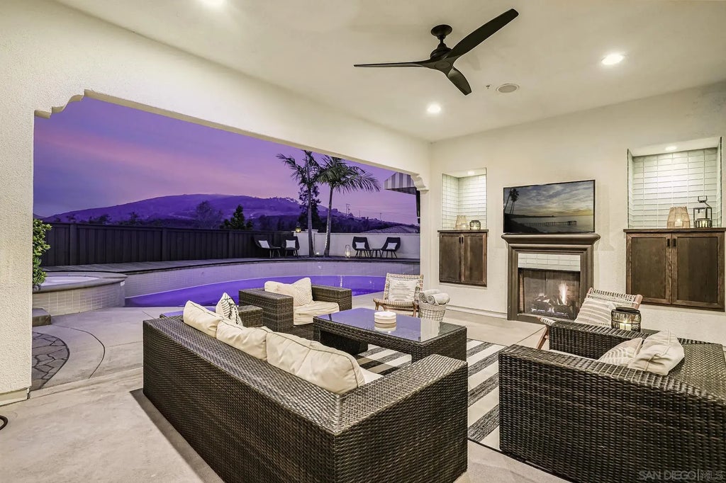 Welcome to 8770 Tillage Lane—an exceptional single-level estate tucked behind the guard gated gates of The Lakes, one of North County San Diego’s most sought-after luxury communities. Built by Van Daele Homes, this thoughtfully designed residence offers the ultimate in privacy, comfort, and indoor-outdoor living, all set on a premium corner lot with stunning mountain views. Step inside to discover soaring ceilings, abundant natural light, and a flexible open-concept layout perfect for both everyday living and elegant entertaining. The spacious great room seamlessly flows into a gourmet kitchen with adjacent breakfast nook, upgraded cabinetry and a generous island—flanked by a bonus flex/playroom ideal for families or creatives and a formal dining room. Bi-fold La Cantina doors create a true California living experience, merging indoor spaces with an entertainer’s dream backyard. Outdoors, enjoy a built-in kitchen, sparkling Pebble Tec salt water pool and spa, newer “Back 9” putting green, and multiple seating areas nestled among lush landscaping and mature citrus trees. Whether hosting friends or enjoying a quiet evening, this backyard oasis offers unmatched tranquility and functionality. Each of the home’s bedrooms has an en-suite bathroom, with large closets, offering space and privacy for all. The office features custom cabinetry for a polished, productive workspace with a separate entrance. Additional upgrades include a smart home Nest system, Flow Tech water treatment system, Sunrun solar, and an epoxy-finished garage with custom storage and a Tesla charger.