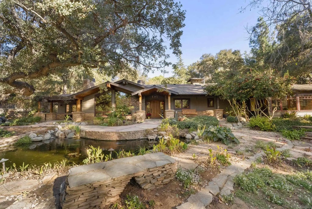 Discover this stunning, custom-designed single-level Craftsman Lodge that seamlessly blends rustic charm with casual sophistication. This serene escape boasts approximately 4,592 sq. ft., including an 840 sq. ft. guest house perched above a spacious 4-car garage with Tesla charging. Step through the grand doors into an inviting entryway, adorned with natural stone, hammered copper ceilings, and vaulted beams. The home features rich wood and stone accents throughout, creating a warm and timeless aesthetic. Outdoors, experience an entertainer’s paradise surrounded by lush gardens, mature fruit trees, and raised planter beds. Tranquil stone pathways wind past a serene koi pond, a sparkling pool with waterfalls and a slide, and a bubbling spa. The property includes a detached art studio, a private sauna, and multiple serene sitting areas for relaxation. For gatherings, the elegant gazebo with an outdoor kitchen is a standout, complete with a stone fireplace, built-in BBQ, and a wood-fired pizza oven—perfect for alfresco dining and entertaining. Whether you’re hosting or unwinding in one of the many peaceful retreats, this home epitomizes the California lifestyle.