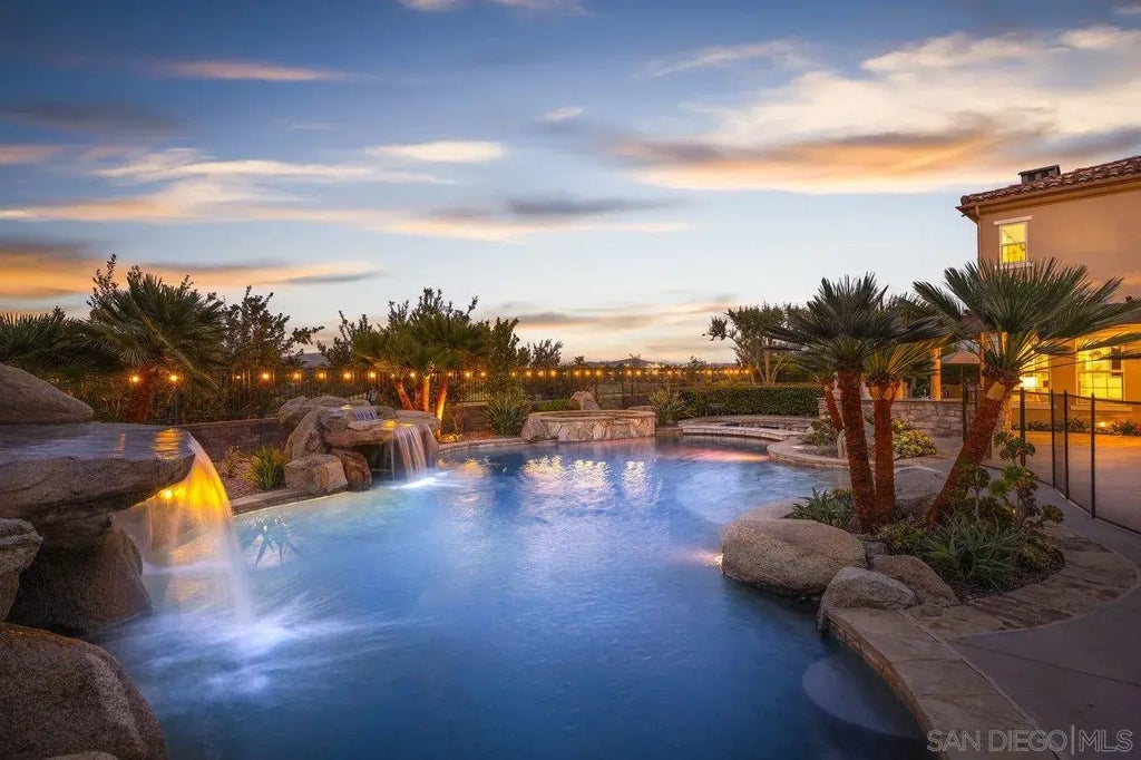 Exquisite and thoughtfully upgraded, this stunning home sits at the end of a quiet cul-de-sac in the prestigious, guard-gated Avaron community of Del Sur. Set on a premium 0.75-acre lot backing to open space with breathtaking mountain views, this 5-bedroom, 4.5-bathroom home offers 4,491 sqft of luxurious living. Featuring a spacious loft and detached office, this home is designed for modern living. Inside, enjoy rich hardwood floors, soaring ceilings, and a gourmet chef’s kitchen with a 48” Wolf range, Thermador dishwasher, Quartzite counters, custom cabinets, and a large island. The downstairs bedroom is set up as a full game and entertainment room with a bar, pool table, wine fridge, and full bath. The backyard is a true private resort, featuring new turf, a saltwater pool with swim-up bar, waterslide, 2 grottos, and an oversized spa. Entertain around the built-in fire ring, outdoor fireplace, and Viking BBQ kitchen. Additional highlights include fully owned solar, security system, surround sound, outdoor speakers, and epoxy-finished garage with storage. Located in the award-winning Poway Unified School District, close to trails, parks, and shopping—this is Southern California living at its best.
