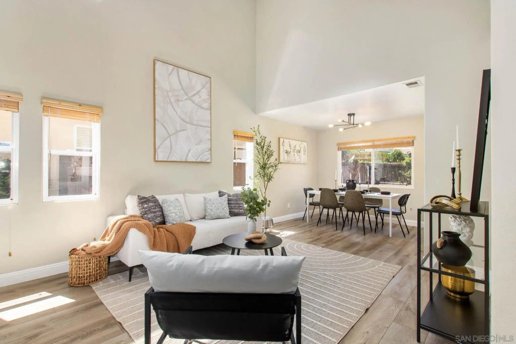 Welcome to your beautifully updated home, where comfort meets convenience! This home boasts a bright and airy space featuring vaulted ceilings and a dramatic vaulted entryway that create a warm and inviting first impression. This move-in-ready residence boasts new luxury vinyl plank flooring throughout most of the home, combining modern style with long-lasting durability. Enjoy excellent natural light throughout, highlighting thoughtful upgrades. All bedrooms are equipped with brand-new ceiling fans to keep you cool and comfortable, and Kwikset SmartKey-enabled locks provide added security and peace of mind. The full size laundry room and smart garage door opener with WiFi connectivity and integrated camera are an added bonus. The low-maintenance back yard is perfect for entertaining or relaxing. Located just minutes from a shopping center featuring Vons, Mendocino Farms, Starbucks, and a variety of dining options, this home also offers close proximity to Sharp Rees-Stealy Medical Center, the I-15 freeway, and the award-winning Dingeman Elementary School. This home blends modern upgrades with an unbeatable location.