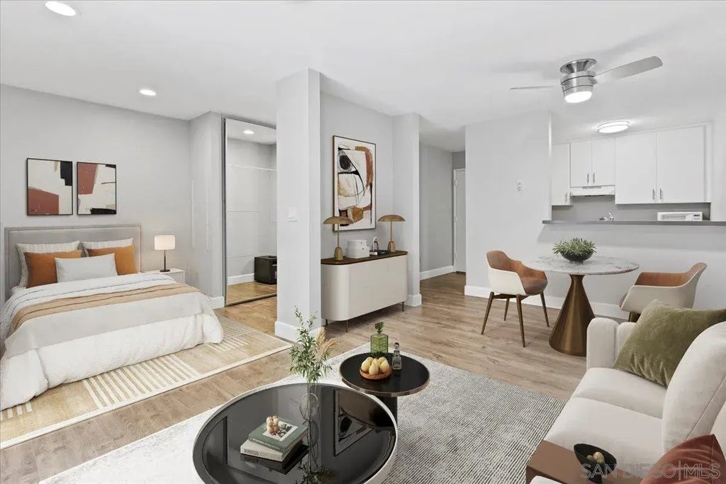 This move in ready and remodeled studio condominium offers stylish living with thoughtful modern touches and a private balcony to enjoy the peaceful surroundings. Inside, you’ll find a combination of laminate flooring and ceramic tile, high profile baseboards, mirrored closet doors, recessed lighting, and a ceiling fan that enhances the open layout. The contemporary kitchen features quartz countertops and designer cabinetry, while the remodeled bathroom includes a tiled bathtub surround, sleek new vanity, updated fixtures, and hardware—all designed for modern comfort and stylish living. Nestled among mature trees within a well-maintained community, this home offers exceptional privacy along with a designated parking space plus a guest parking. Residents enjoy a wide array of amenities, including a sparkling pool and spa, sauna, gym, tennis and basketball courts, BBQ area, clubhouse, and convenient laundry facilities. Perfectly located on the west end of Mission Valley, you’re just minutes from downtown San Diego, the beach, trolley access, USD, shopping, and top-rated restaurants. Ideal as a primary residence, second home, or investment property—this VA-approved condo is a fantastic opportunity you won’t want to miss.