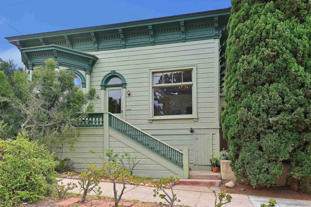 Crowning the corner since 1896, the historic H.E. Watts House affords unique opportunities with its “commercial community” zoning. Heavy scrolled wood brackets beneath the cornice, 12-foot ceilings, perfectly patinated doors, formed metal and marble fireplace and wide-plank wood flooring all encapsulate Victorian craftsmanship and yesteryear charm. Each side of vaulted entry features 8-foot paneled fold back doors to spacious living areas and primary bedroom. Whether residential or professional, potential abounds for a cornerstone of San Diego’s architectural history