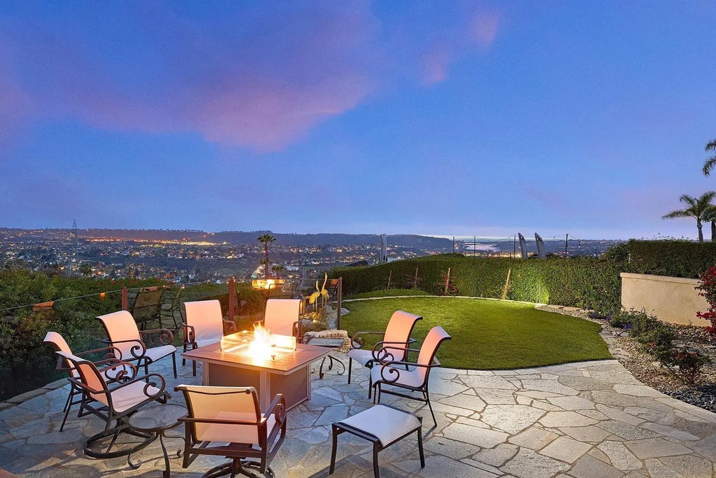 Prepare to be amazed by some of the BEST VIEWS in all of La Costa! This highly upgraded single-story custom home is situated on a large 1/4 acre lot with incredible indoor/outdoor living and gorgeous GOLF COURSE, LAGOON, & OCEAN VIEWS! Upon arrival, be greeted by a tranquil fountain and beautifully landscaped surroundings that set the tone for this exquisite property. Step inside to find elegant wood flooring, soaring ceilings, and premium upgrades throughout. The formal living room showcases a floor-to-ceiling gas fireplace, recessed lighting, and expansive windows that invite natural light to fill the space. The adjacent dining area features built-in cabinetry and access to a side yard with beautifully crafted bevel glass overlay. The recently refreshed chef’s kitchen is an entertainer’s delight, equipped with stainless steel appliances, a double oven, a spacious island, rich wood cabinets, LED lighting, and a cozy breakfast nook. A welcoming family room with built-ins and a charming gas fireplace rounds out the living areas. The spacious primary suite boasts high ceilings, stunning views, patio access, and an en-suite bath complete with a soaking tub, shower, and a walk-in closet. Each additional bedroom is designed with comfort in mind, featuring ceiling fans, plantation shutters, and wood flooring. Step outside to savor the serene California room, adorned with firefall, exquisite stone and wood detailing, a built-in BBQ and sink, and ample seating for al fresco dining. Enjoy the picturesque views while relaxing or practicing your swing on the putting green. See supp.