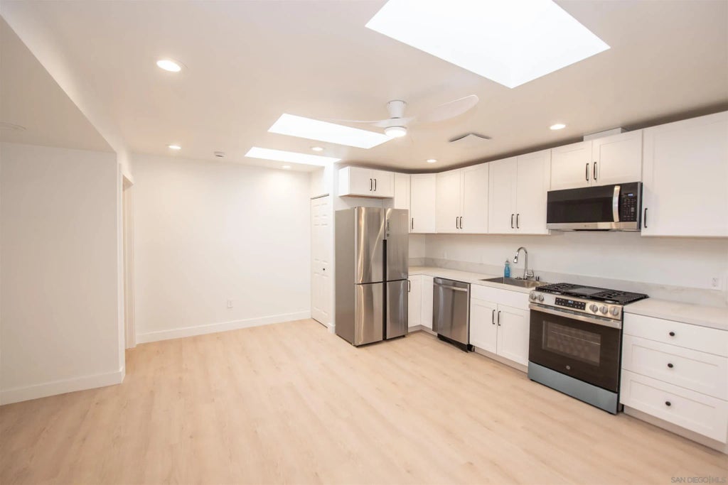 Brand new remodell! Open space floorplan. All brand new inside. New kitchen, all new cabinets, new stainless steel appliances, new skylights, all new bathrooms and new light fixtures, new designer paint. House has its own small private patio. Parking for 2 cars.