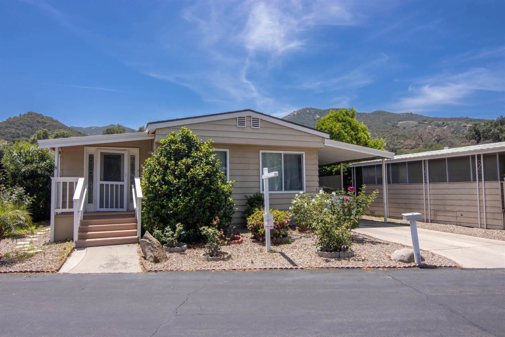 Welcome to Space 45 at Champagne Village, a sought-after 55+ tranquil wonderland community in the hills of Escondido, right near the Lawrence Welk Resort. This land-owned spacious 2-bedroom, 2-bathroom home sits a couple of steps away from the golfing course. Step inside and be greeted by natural light seeping into the living area, complemented by expansive windows and sleek wood laminate floors. Upgraded bathrooms, home includes stainless appliance, washer and dryer. Beautiful private patio offers privacy and views- perfect for relaxation. Community offers gym, RV storage, golf course, dining hall and much more. Do not miss out on this affordable gem.
