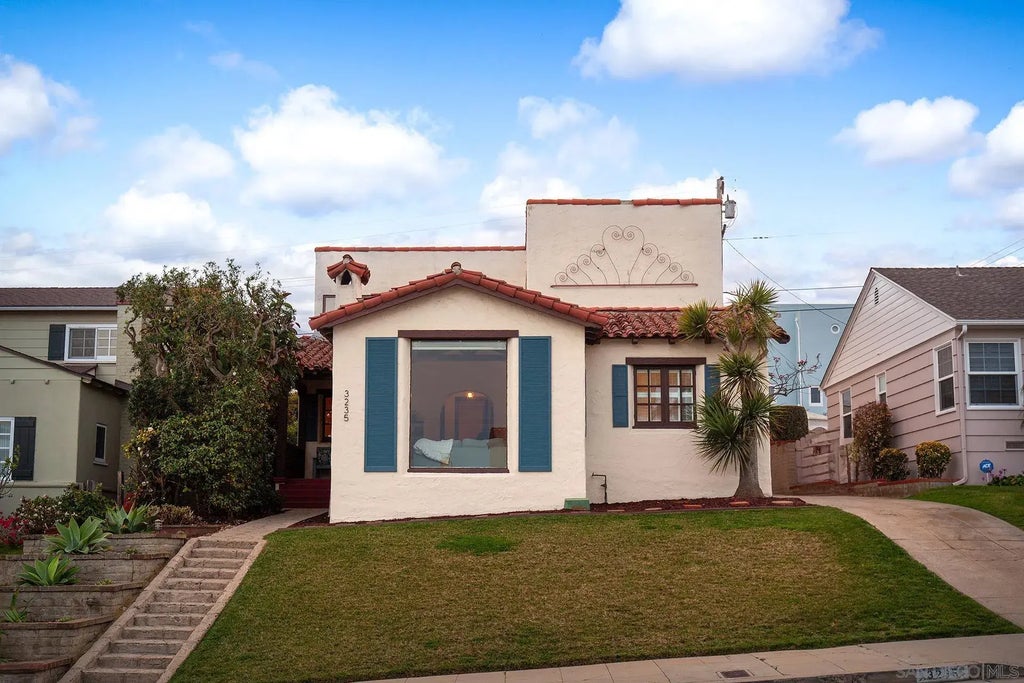 Majestic 1929 Spanish Revival home! From the minute you approach this 4 bedroom, 3 bath home with 2620 est. sq. feet, she will romance you! The rustic stairs and walk way will lead you to this elevated lot, spacious covered porch & Mahogany 12 panel front door with a speakeasy. Once inside, you are greeted by the Turret wood beamed ceiling and tile floor entry. Arched doorway and wrought iron gate welcome you into the step down Living area. Original Sconce lighting with breathtaking distressed open beam, trellised, Adzed wood ceilings. Romantic, floor to ceiling brick decorative fireplace and large picture window with city & harbor views. Coved ceiling, formal dining room. Beautiful hardwood floors in most every room (excluding the entry, bathrooms, stairs and Primary BR). The remodeled kitchen has Quartz counter tops, butcher block island, farm sink and stainless appliances. The laundry hookups are hidden inside the custom cabinets. French doors open to your private back courtyard patio with raised planters. The main level has 3 bedrooms / 2 baths (completely remodeled). The upper level has panoramic views of Downtown, City lights, Harbor, bay and Coronado bridge. Primary bedroom with ensuite bath and oversized Family room. 1.5 -2 car detached garage with a long driveway allow for off street parking, approximately 4 cars or RV or Boat parking. Three blocks to Liberty Station! Don't miss this rare gem!